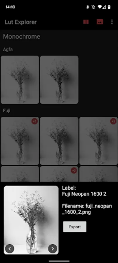 Lut Explorer contains collections of 'LUT' filters that can be previewed in-app and exported for use in other image editing and camera applications. Lut Explorer does not itself have any image editing capabilities.