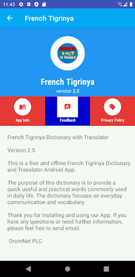 The app has an Offline Dictionary containing both French-to-Tigrinya definition and Tigrinya -to-French definition for words.