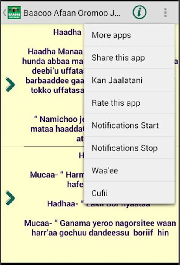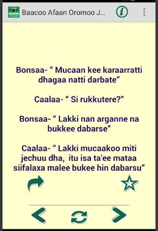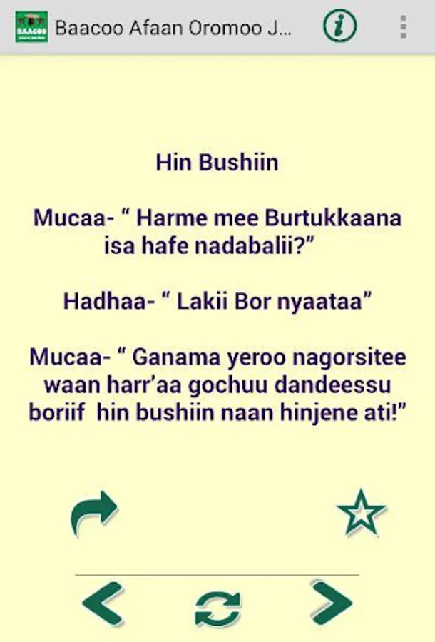 The App contains Jokes (Baacoo, Qoosa) in Afan Oromo language. The jokes reflect daily life events with the taste of humor. Enjoy the jokes.
