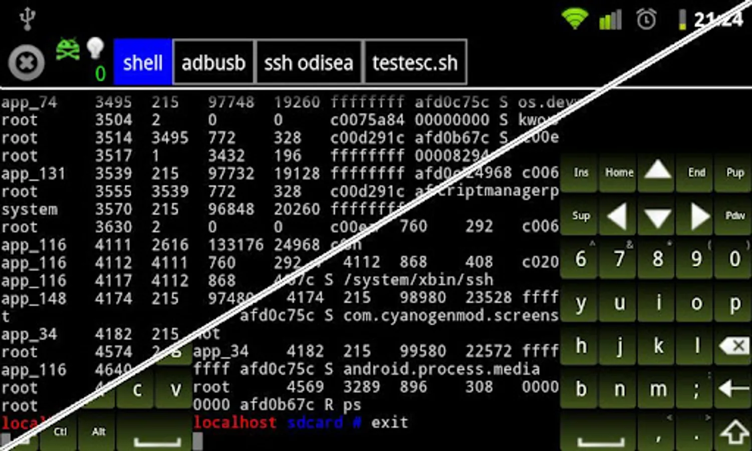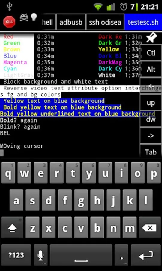 WEIRD CHARACTERS: If you get a lot of [[^ characters, is due you have "extra gestures" enabled and script/program doesn't process them. Use most right side of screen to send standard scroll event, or disable "extra gestures"