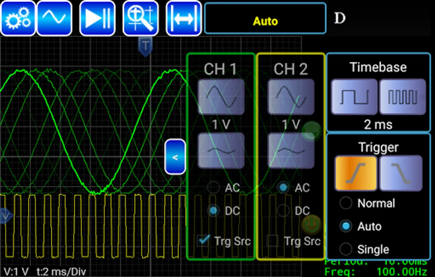 direct voltage, alternating voltage, direct current, alternating current, time, time delay, phase, phase difference, frequency to view live waveforms, make measurements.