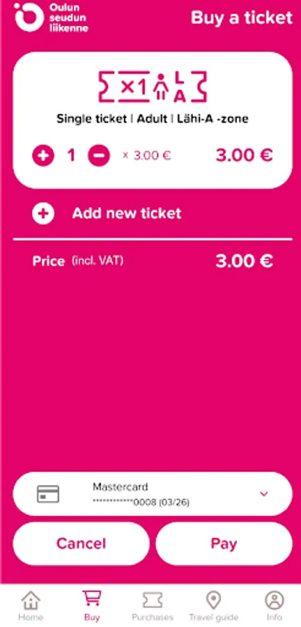 Pay for your ticket in the app with a Visa, Visa Electron or Mastercard payment card (debit and credit), mobile payment or MobilePay.The ticket is activated at the moment of purchase.