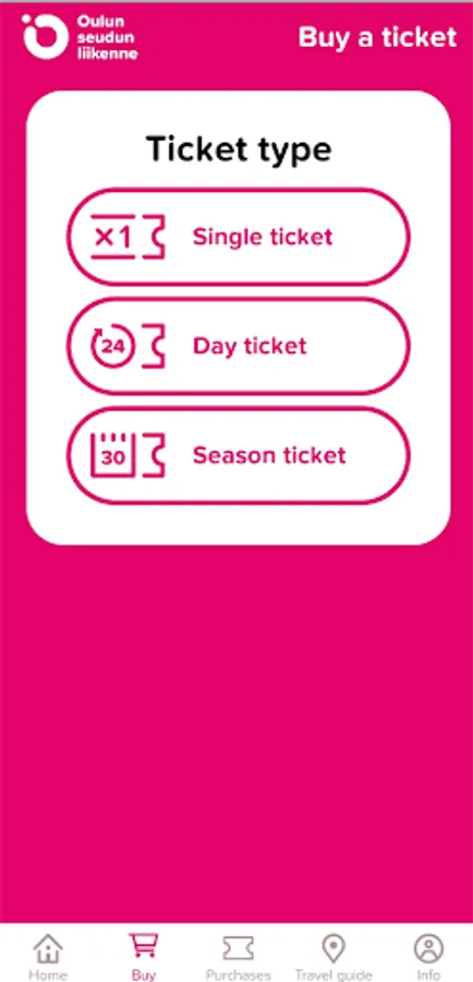 The OSL app makes it easy to buy tickets for Oulu Region transport. The mobile ticket is read by the card reader when you get on the bus. The ticket displays a QR code and the remaining validity period. Tickets are valid on all buses throughout the Oulu Region public transport travel area. You can buy more than one ticket at a time. Downloading the app is free of charge.