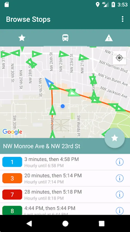 - Browse stops on the map. See which routes arrive at that stop, and when they will arrive.