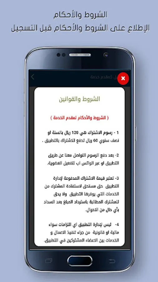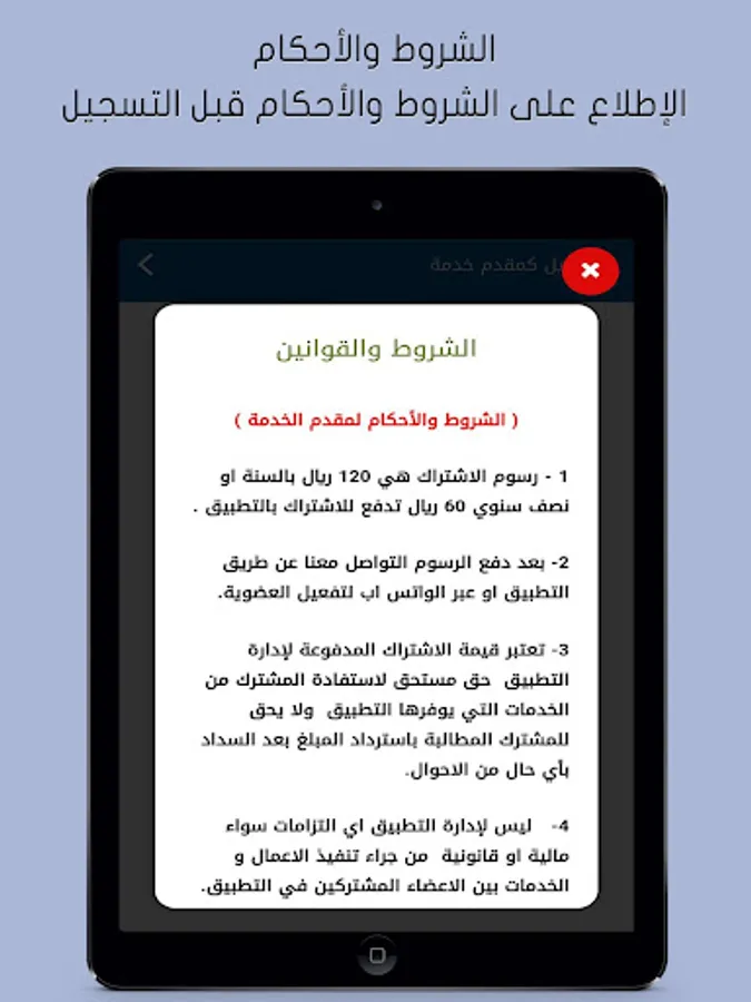 6 - Page Terms & Conditions: where are clarified Terms & Conditions and Privacy Policy for your application is not registered or activated user only after reviewing the policy and the terms and conditions of application