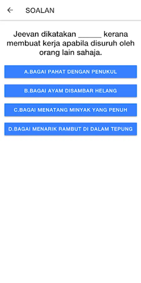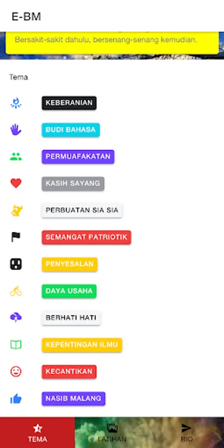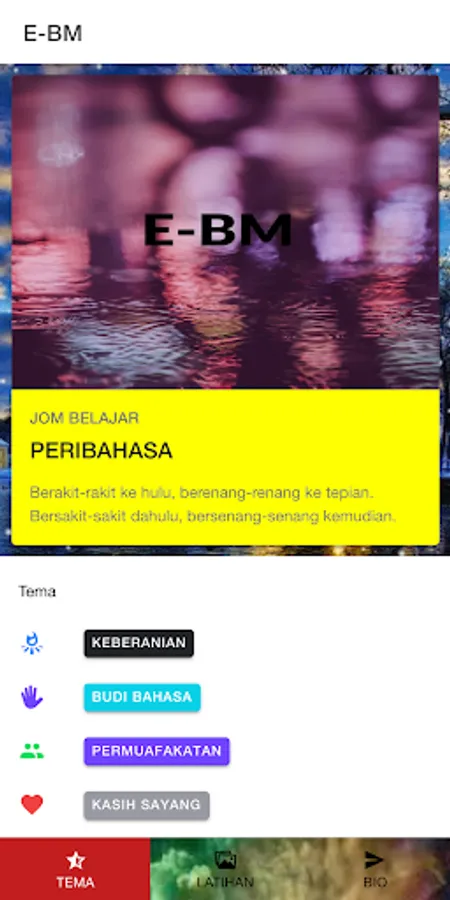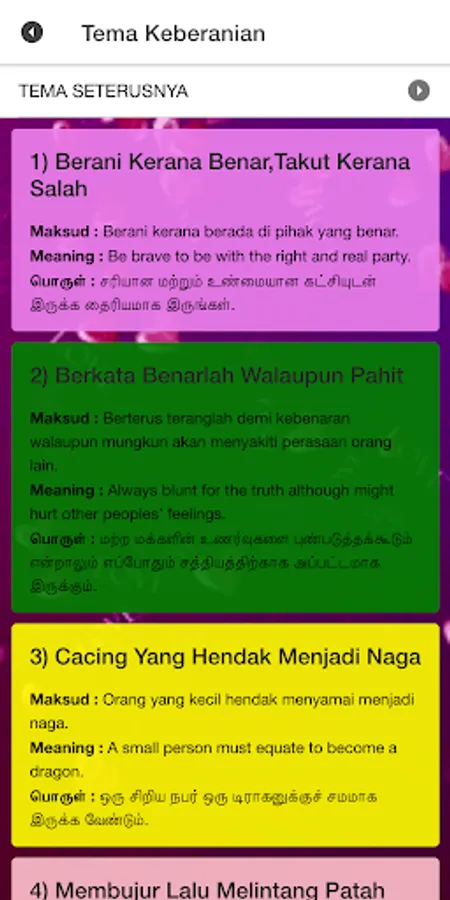 Peribahasa merupakan ayat atau sekumpulan kata yang tersusun dan mengandungi makna atau pengertian yang tertentu.Susunan katanya pendek tetapi menepati makna yang ingin disampaikan.Seseorang individu yang mahir menggunakan peribahasa dianggap telah menguasai kemahiran berbahasa dan mempunyai pengertian yang tinggi dalam bahasa Melayu. Aplikasi ini mengandungi peribahasa Melayu berdasarkan temanya.Aplikasi ini mengandungi sebanyak 12 tema bersama maksud dalam bahasa Melayu, bahasa Inggeris dan bahasa Tamil.Ini memudahkan para pelajar memahami setiap peribahasa secara lebih mendalam dan terperinci.Mereka dapat menjimatkan masa kerana peribahasa telah diagihkan berdasarkan 12 tema.Aplikasi ini juga akan memudahkan proses Pengajaran dan Pembelajaran (P&P) pelajar dan guru untuk mencari maksud peribahasa.Keunikan aplikasi ini adalah pembahagian maksud peribahasa dalam bahasa Melayu, bahasa Inggeris dan bahasa Tamil.Penggunaan aplikasi ini bukan sahaja untuk pelajar sekolah rendah malah boleh digunakan oleh pelajar sekolah menengah.