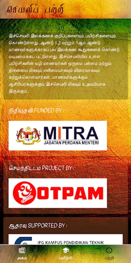 This app consists of Tamil grammar notes and exercises for Year 1,2 and 3 students with multiple grammatical elements.