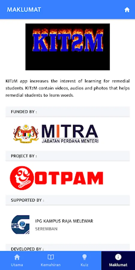 Skills of reading and spelling are very important for students to be achieved in order moving towards new era of education. The objective of creating this KIT2M app is to increase the interest of learning for remedial students. KIT2M contain videos, audios and photos that helps remedial students to learn words. This app also help students to learn various words based on the photos and audios that given and many types of exercises in the form of electronic as an additional activity.
