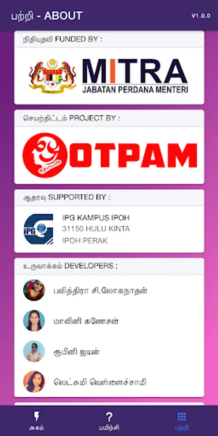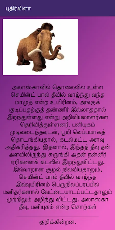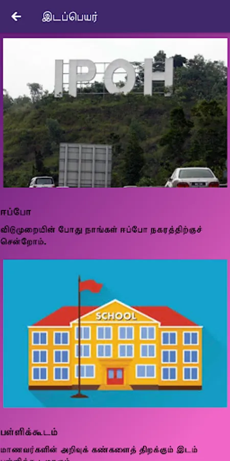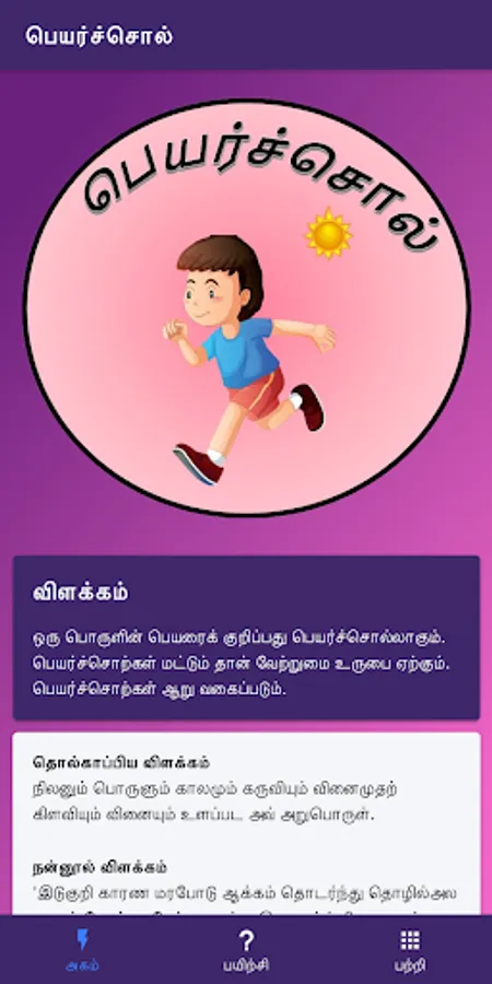This app helps tamil learning students to know basic of noun(peyarchol). This is the first peyarchol app available in google play store. In this app we include some short notes, pictures and exercises regarding peyarchol. Learners will have a chance to know more about peyarchol. This app also ensure that the learner to have fun while learning through this app.