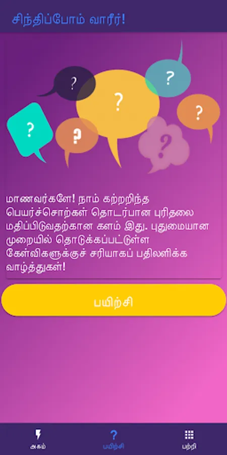 Welcome to Peyarchol app. This app was developed for Tamil Learning Students to learn and practise about Noun(பெயர்ச்சொல்). So that we were named this app as Peyarchol. This app can will be very much useful for teachers, students in tamil teaching and learning.