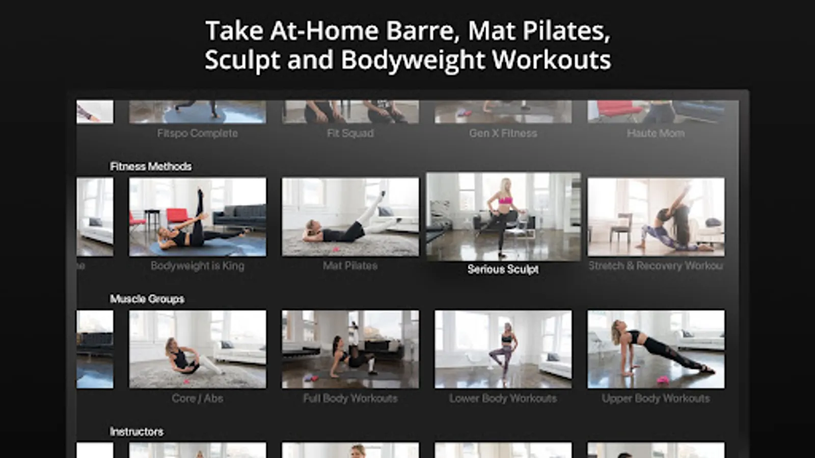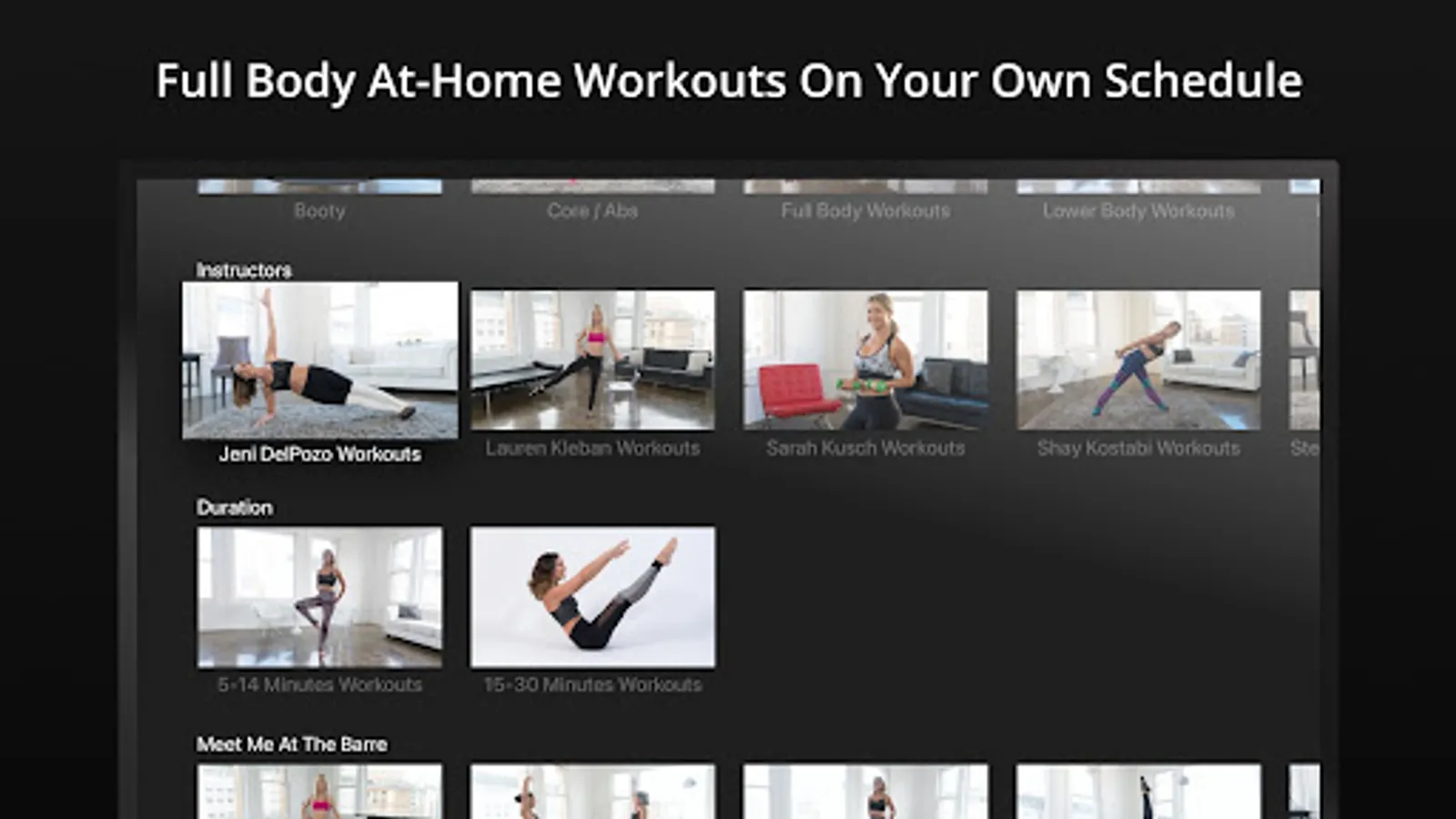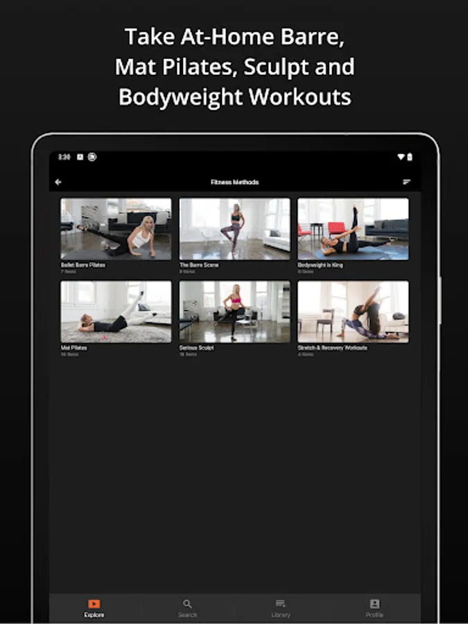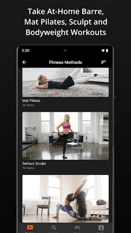 Choose the fitness method you want - Barre, Mat Pilates, Bodyweight exercises, Sculpt, Stretch / Warmup - OR choose the muscle group you want to focus on: arms, booty, legs, core.