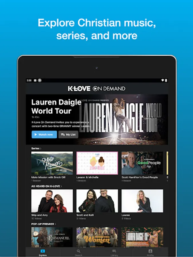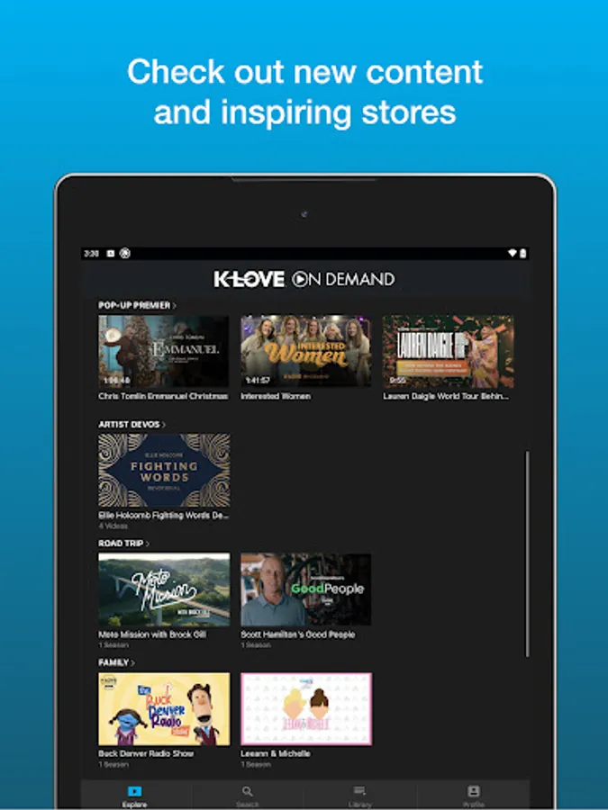 K-LOVE On Demand! Positive and encouraging content that brings you closer to the music! In-depth artist interviews and thoughtful devotionals reveal their hearts and motivation- their love for Jesus! Fun lifestyle adventures with your favorite artists include cooking, travel and more.