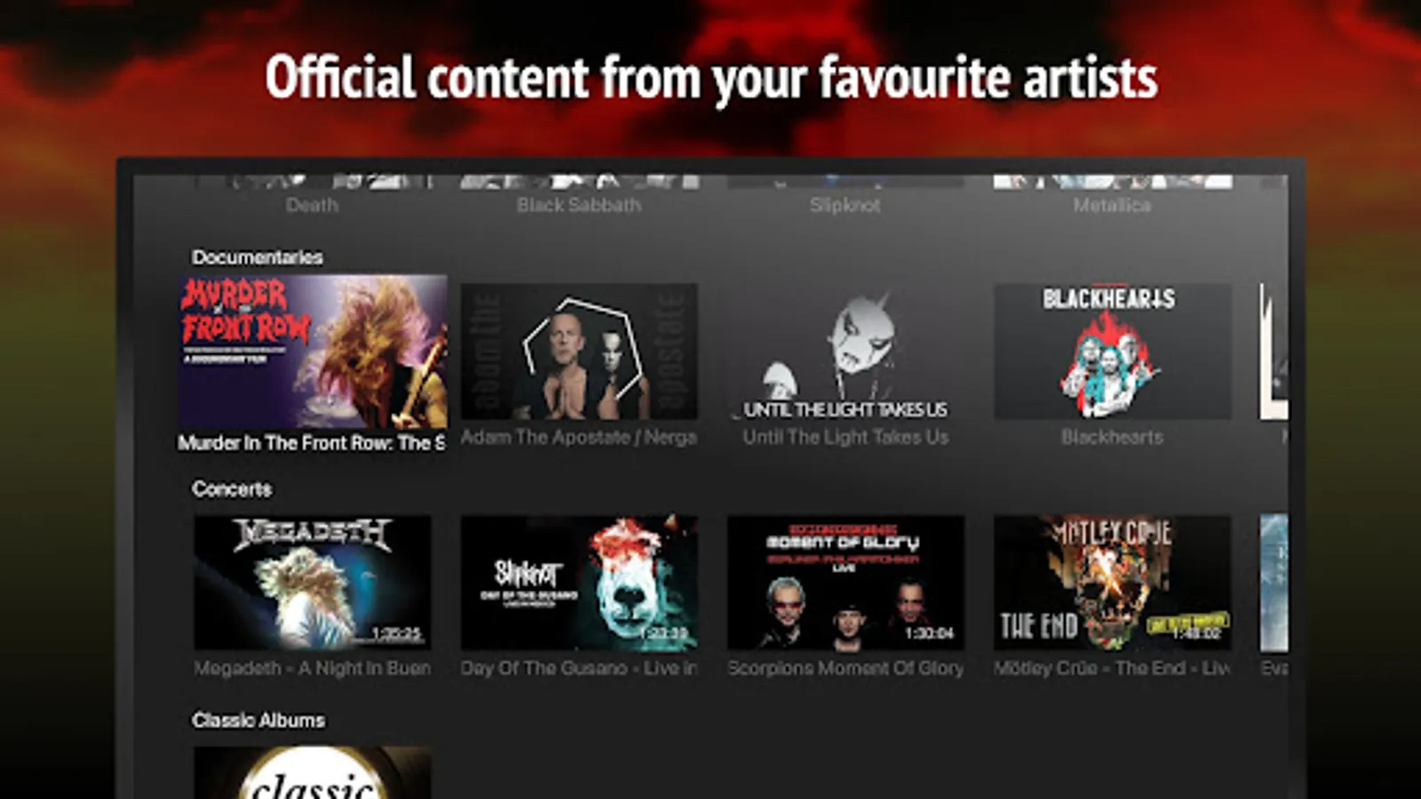 Get ready to rock with the world’s first streaming video on deman platform dedicated entirely to Heavy Metal! Dive into the best in metal from around the world with access to hundreds of music videos, live performances, documentaries, and feature films.