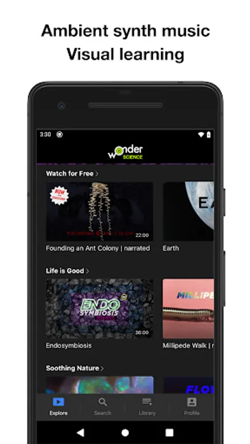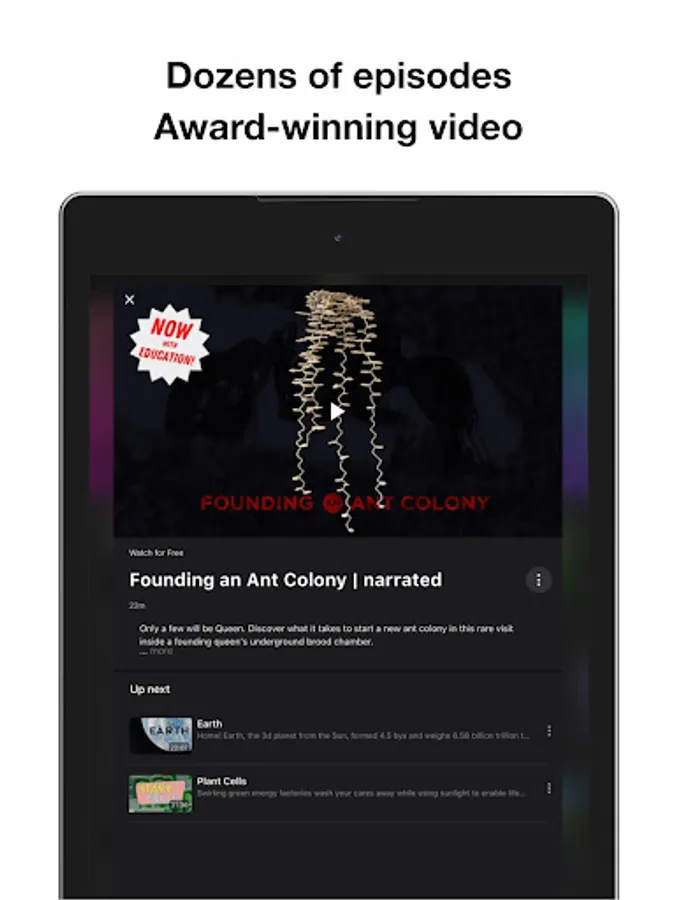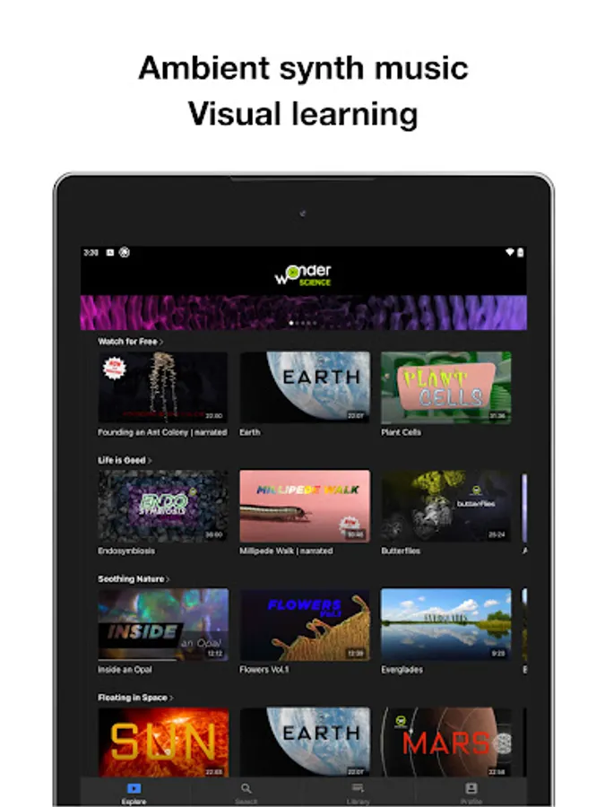 Like a moving picture book, the simplicity of our format quiets the mind and creates space for authentic wonder and curiosity to spark. Throughout hours of uninterrupted science, episodes work their wonders unobtrusively. Occasional narration will take you on a deep dive. Original synth soundtracks help to hypnotize. Your happy place awaits.