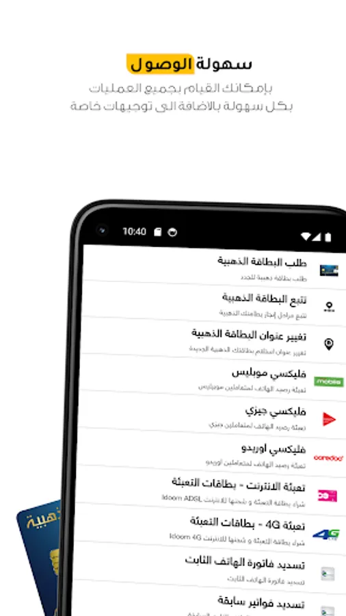 You can benefit from the financial golden card services, remotely via your smart phone. All services are available, whether regular, administrative or financial, without contact. You can take the following actions:
