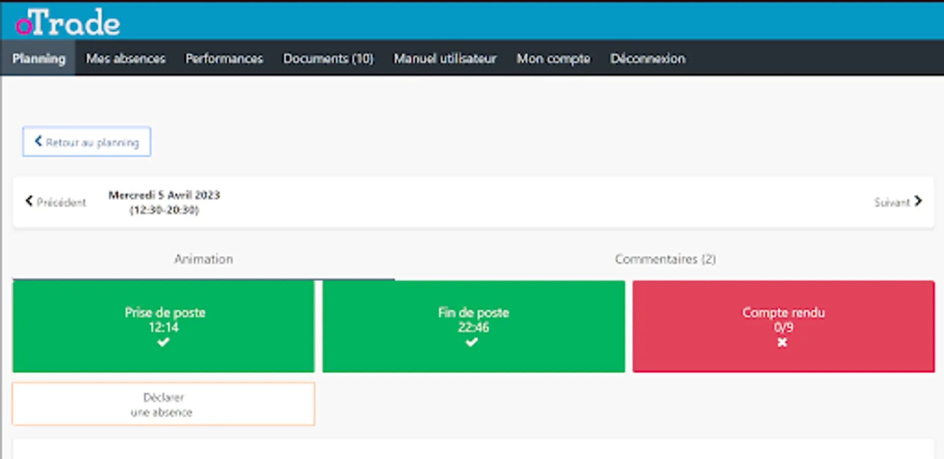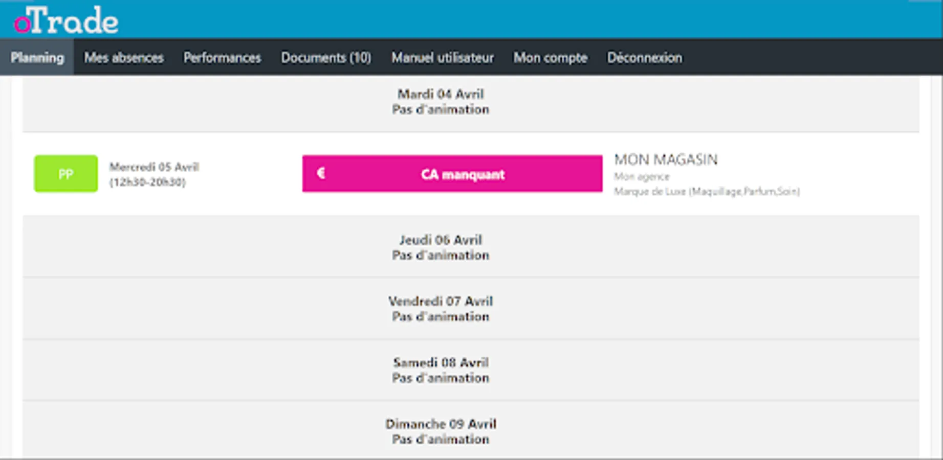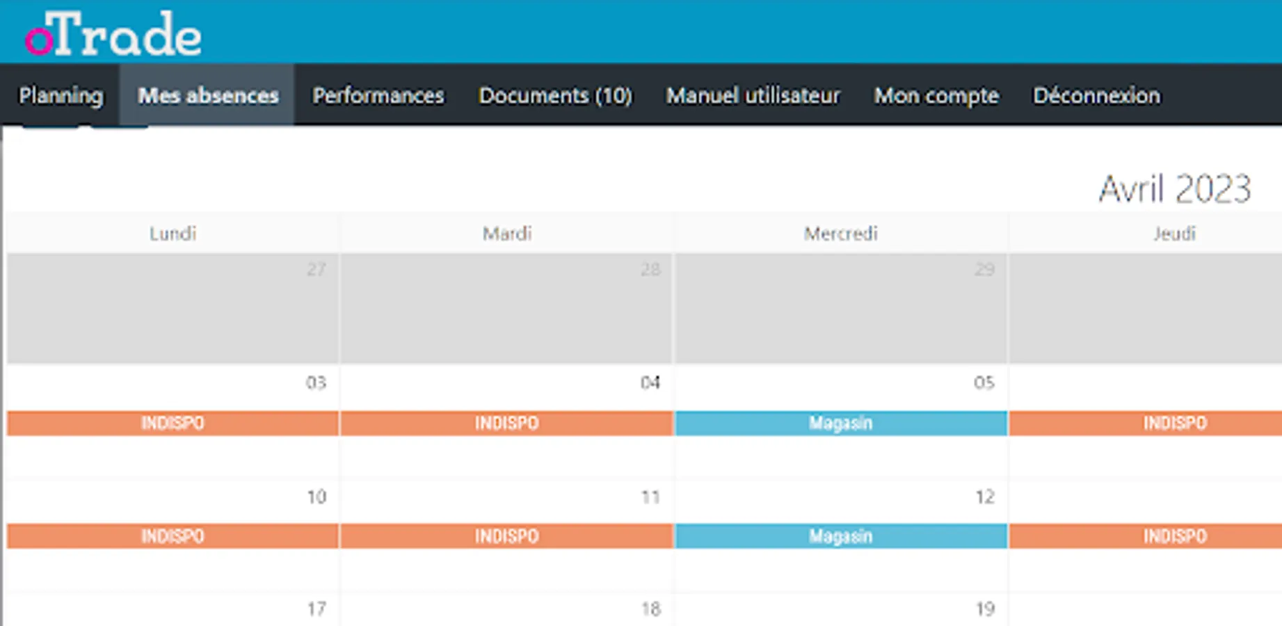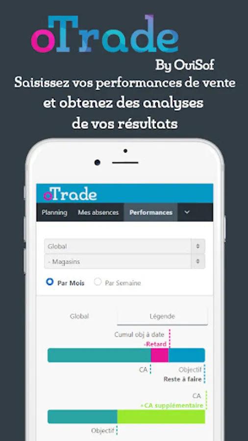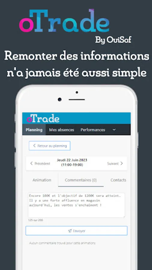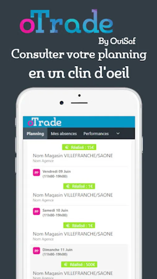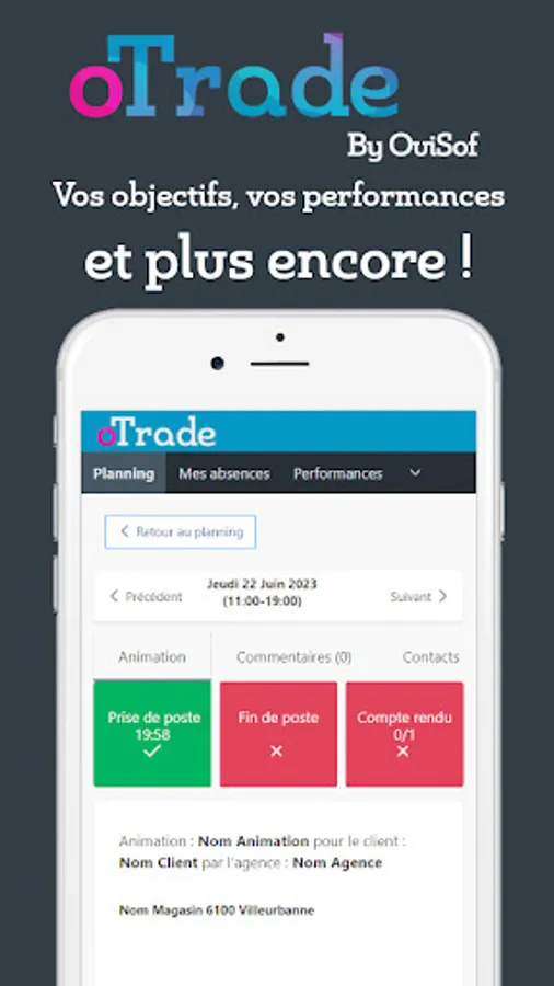 A mobile application that allows you to access your oTrade schedule. To access the latter, you must have an account previously created by your agency. Once connected, you will be able to view your schedule and upload your field information.