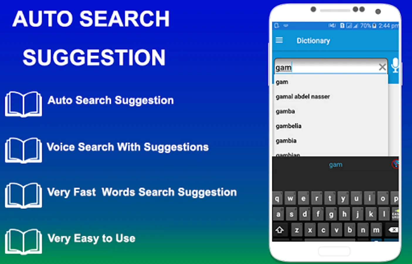 “offline English Dictionary” is its intelligent searching when user type words it automatically display that words which user are looking for and also with spelling check Algorithm.