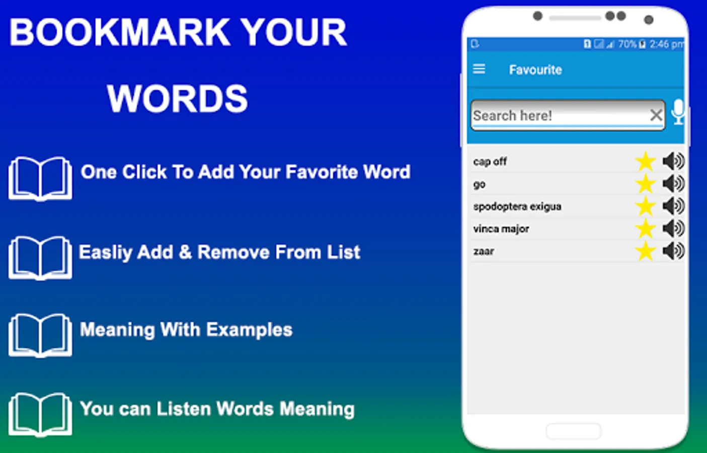 Words with Meaning Examples, Synonyms, Antonyms, and Hyponyms Work completely offline no need of Internet or any further file to download. Now build your Vocabulary with the help of Offline English Dictionary. A Mobile based English Dictionary is ideal for everyone especially for Academic like Students. And Best helpful for English Learner.