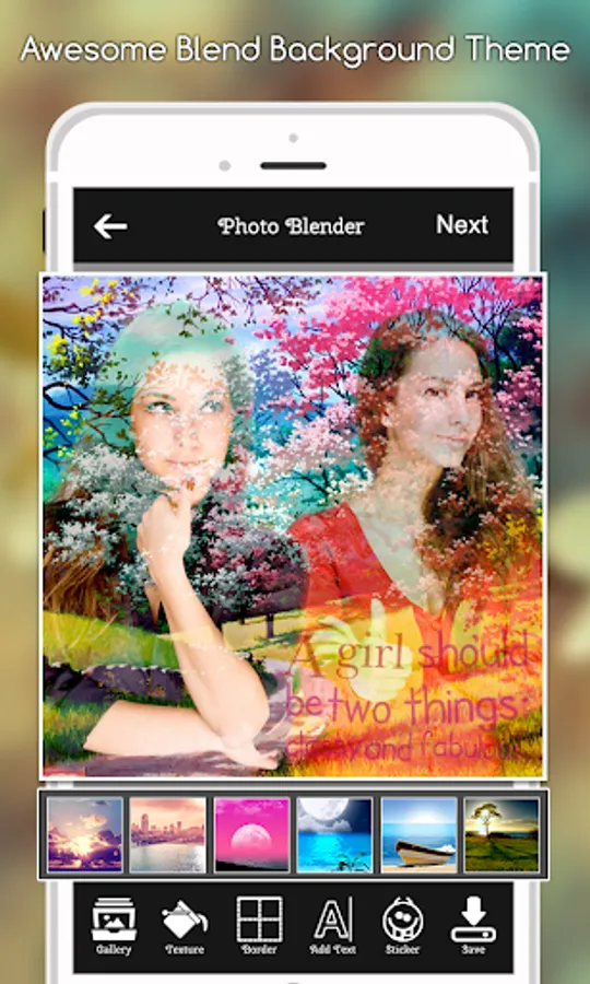 Make your normal daily photos more interesting with ease, just select a picture from your gallery or capture from camera and mix this picture with our existing stunning picture collection or choose another picture from camera/gallery and blend them together to get an amazing result.