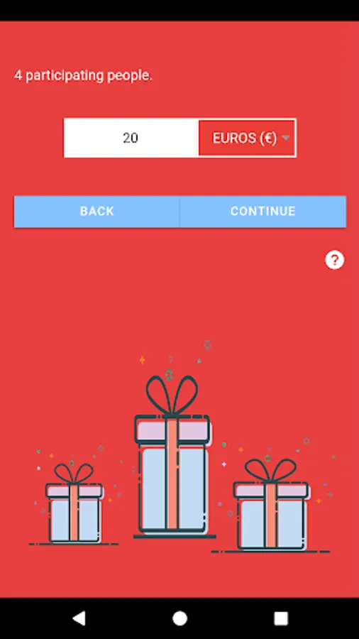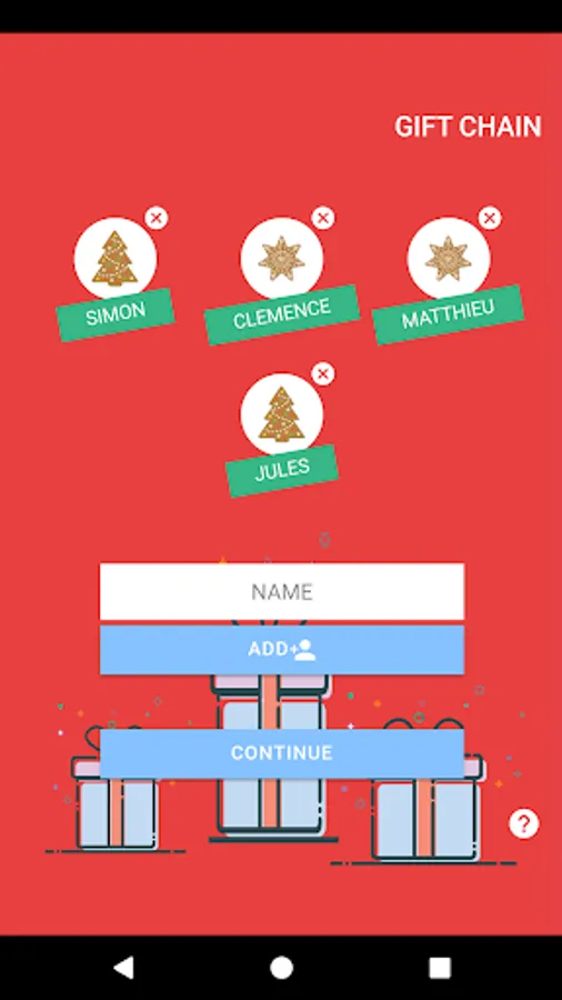 Enter the name of each person around you as well as the amount of the gift and let the application decide to whom each guest must offer his gift!