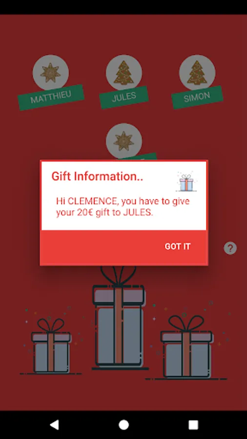 Enter the name of your friends or family -> Choose a gift price -> Let the application decide which gift is for whom!