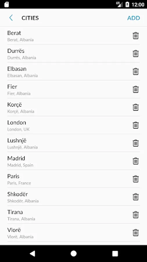 Tirane, Durres, Elbasan, Shkoder, Vlore, Korce, Fier, Berat, Lushnje, Kavaje, Pogradec, Lac, Gjirokaster, Patos, Kruje, Kucove, Kukes, Lezhe, Sarande, Peshkopi, Burrel, Corovode, Cerrik, Shijak, Librazhd, Tepelene, Gramsh, Polican, Bulqize, Allows, Fushe-kruje, Kamze, Rreshen, Ballsh, Mamurras, Erseke, Bajram curri, at peqin, Selenice, Bilisht, Roskovec, Puke, Memaliaj, Rrogozhine, Ure vajgurore, Himare, Vore, Delvine, Koplik, Maliq, Perrenjas, Krume, Orikum, Libohove, Fushe-arrez, Shengjin, Rubik, Milot, Leskovik, Konispol, Kelcyre, Kraste, Kerrabe, Kurbnesh, Fierze, s.a. klos, Ulze...