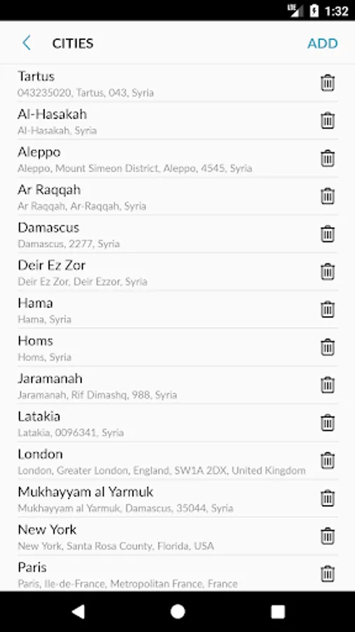 Aleppo, Damascus, Homs, Latakia, Hama, al-Raqqa, Deir-ez-Zor, Al-Hasaka, Kameshli, Yarmouk, Tartous, Jaramana, Duma, Manbij, Idlib, dera'a, Hajar Aswad, Darayya, As-Suwayda, Ath Thawrah, Harasta al-Bas, As Salamiyah, As Safirah, Al Bab, As Sabinah, Ma arrat al-Numan, Jableh, Mu adamiyat ash Sham, Palmyra, Babila, Nawa, Jadidah Artuz, 'Irbin, Kobané, Zamalka, At-Tall, Al-Mayadin, Al-Kiswah, Abu Kamal...