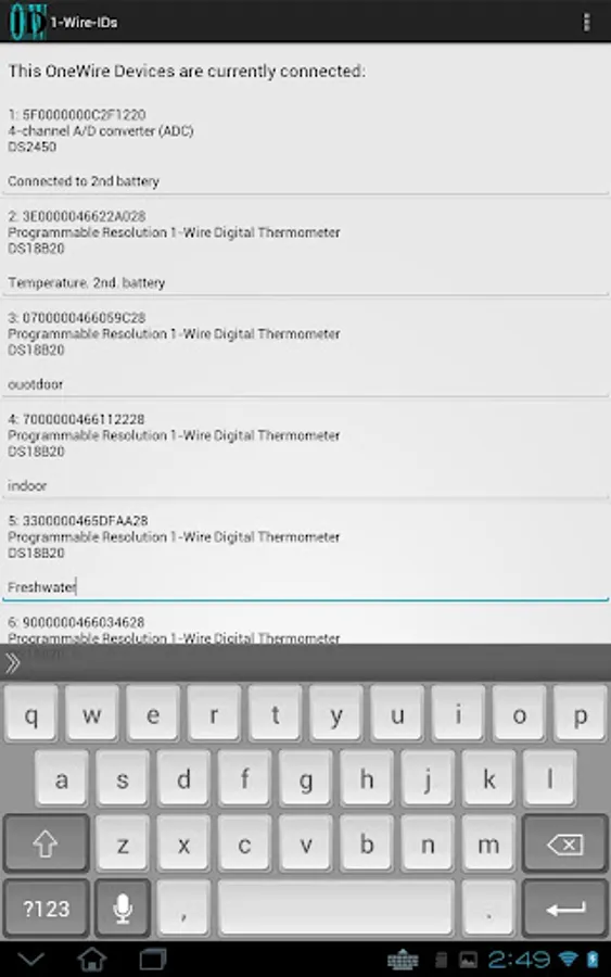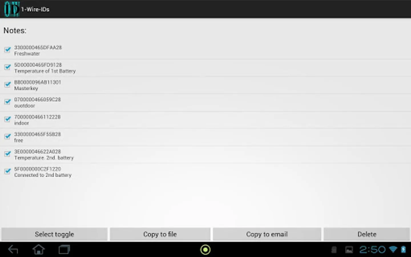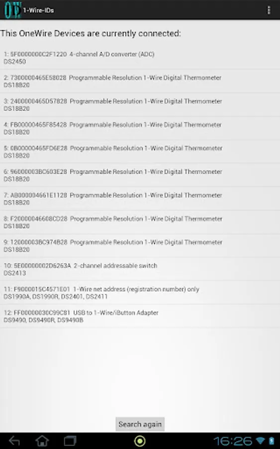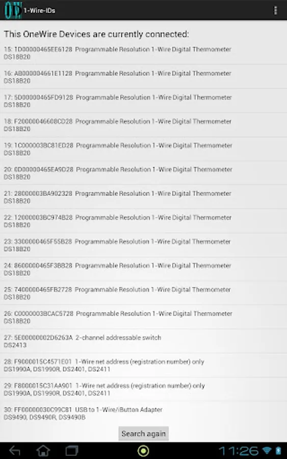 The app will show the unique IDs of all connected devices (OneWire and iButton). In addition, it identifies and displays the type of device, and which product code it might be. It can identify more than 40 different types of device.