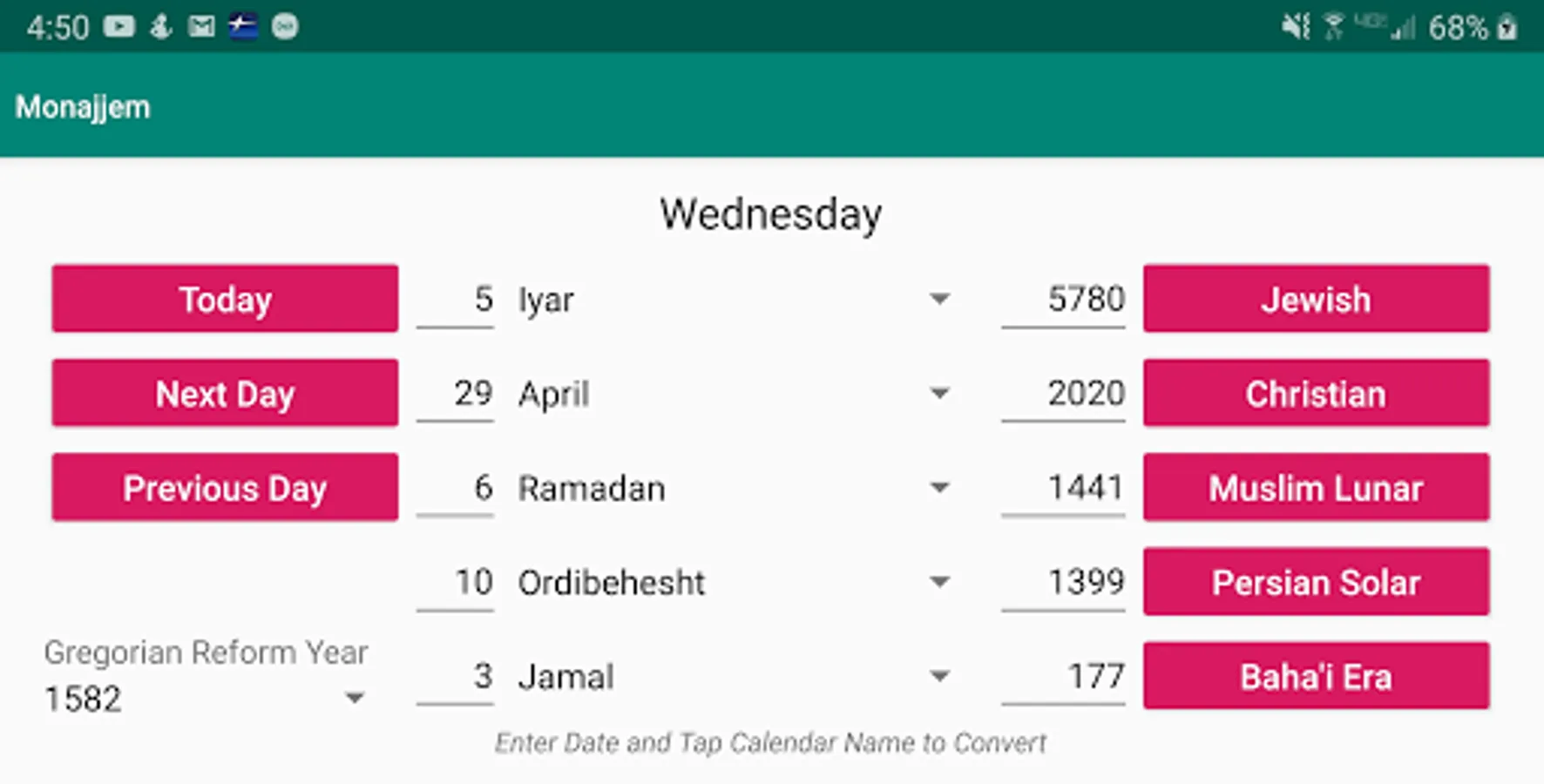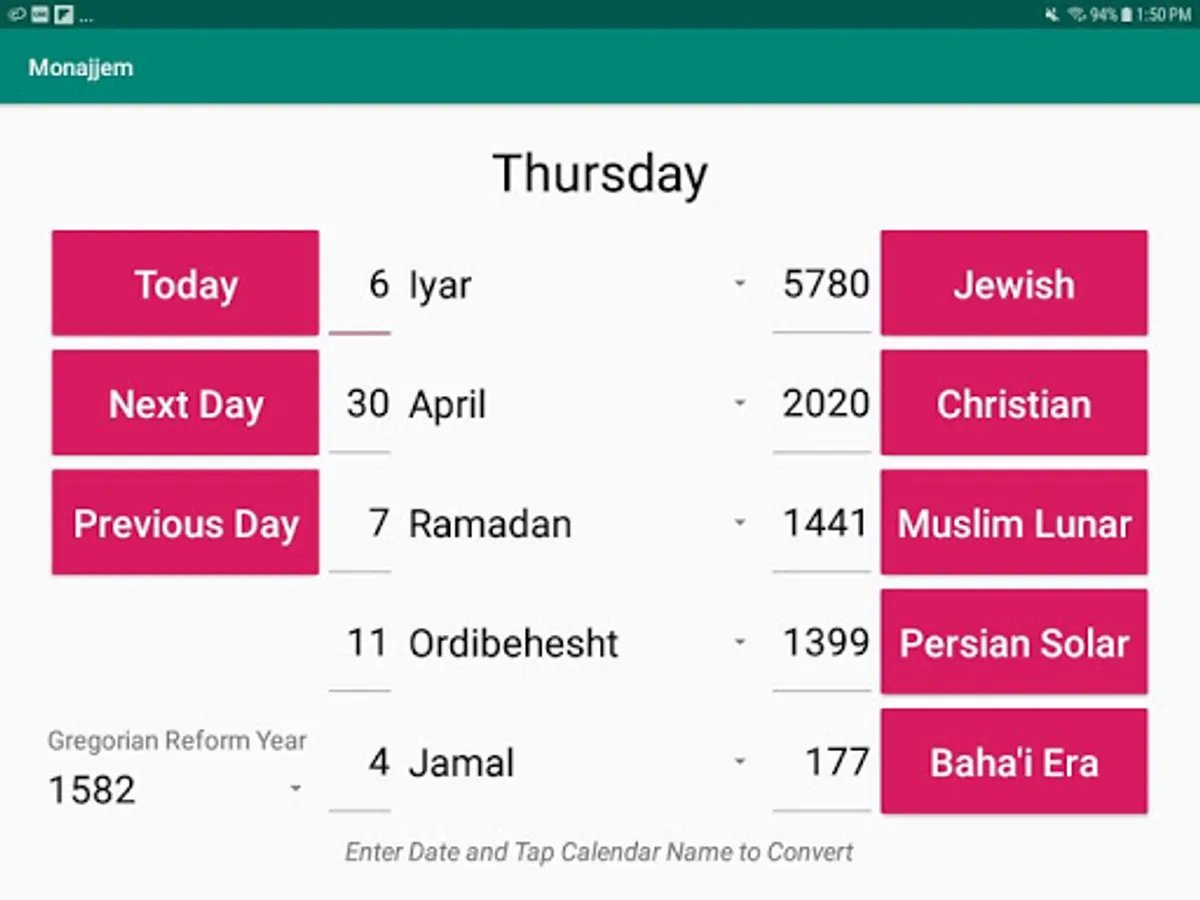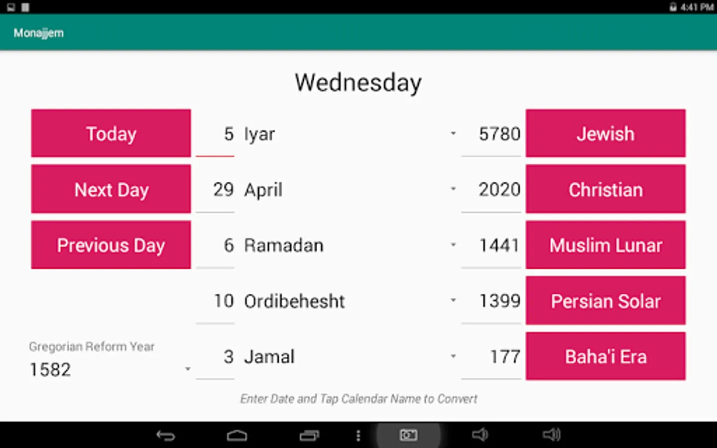 Monajjem is a calendar date converter capable of converting dates in 5 calendars: Jewish, Christian/Gregorian, Muslim Lunar, Persian Solar and the Baha'i Era. On start-up, today's date is displayed in all 5 calendars. After entering a date, tapping the corresponding calendar name causes the date to be converted and the equivalent dates in the other 4 calendars to be displayed. Tapping the Today button causes today's date to be displayed in all 5 calendars. Tapping the Next Day or the Previous Day button causes the displayed dates to advance or go back by one day, respectively. For the Christian calendar, the year in which the Gregorian reform was adopted can be selected as 1582 or 1752. For all calendars except the Baha’i calendar years 1-9999 are supported. For the Baha’i calendar years 1-221 are supported. If a date falls out of this range, nothing will be displayed for that calendar. Monajjem operates in landscape mode only.