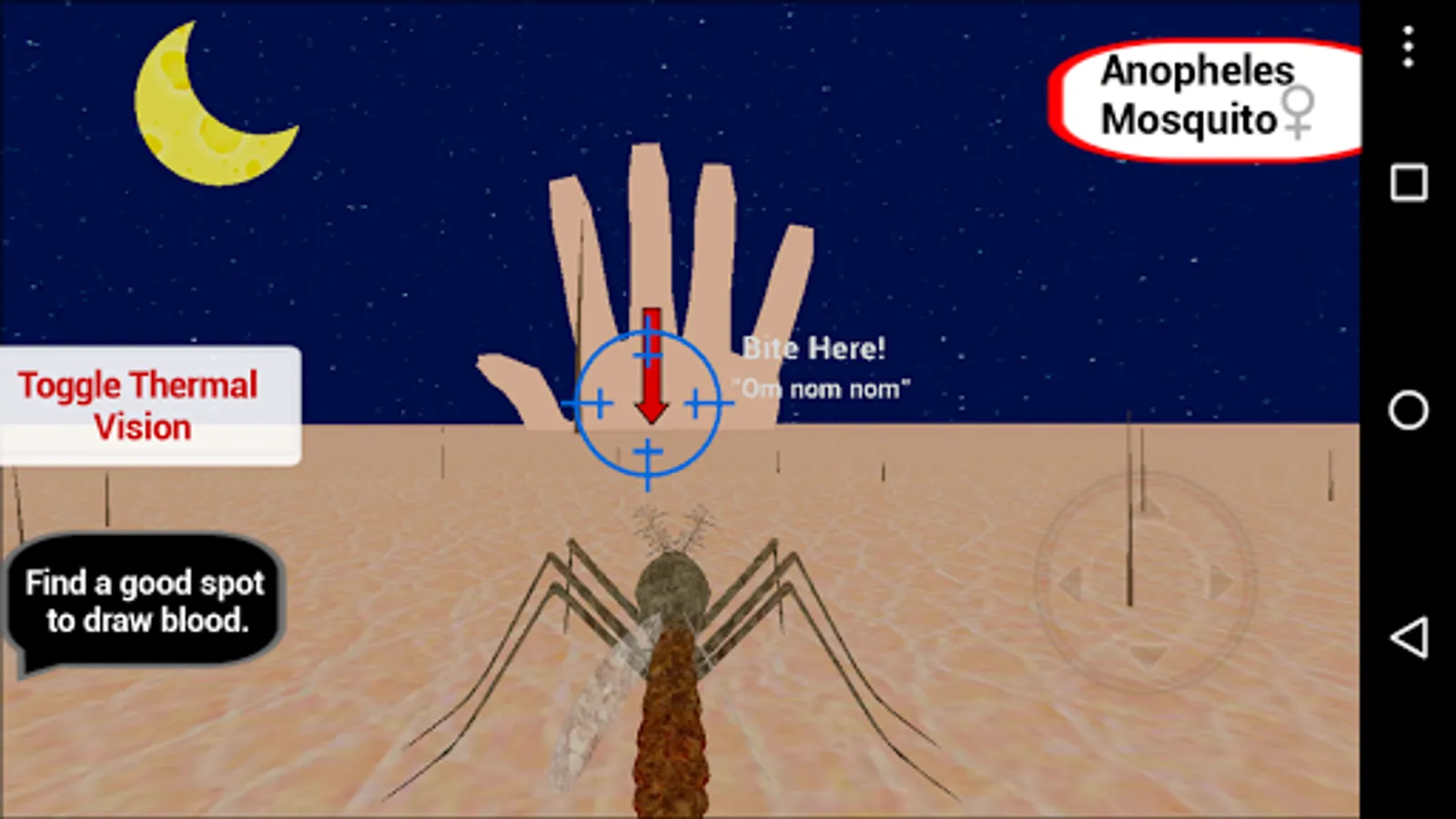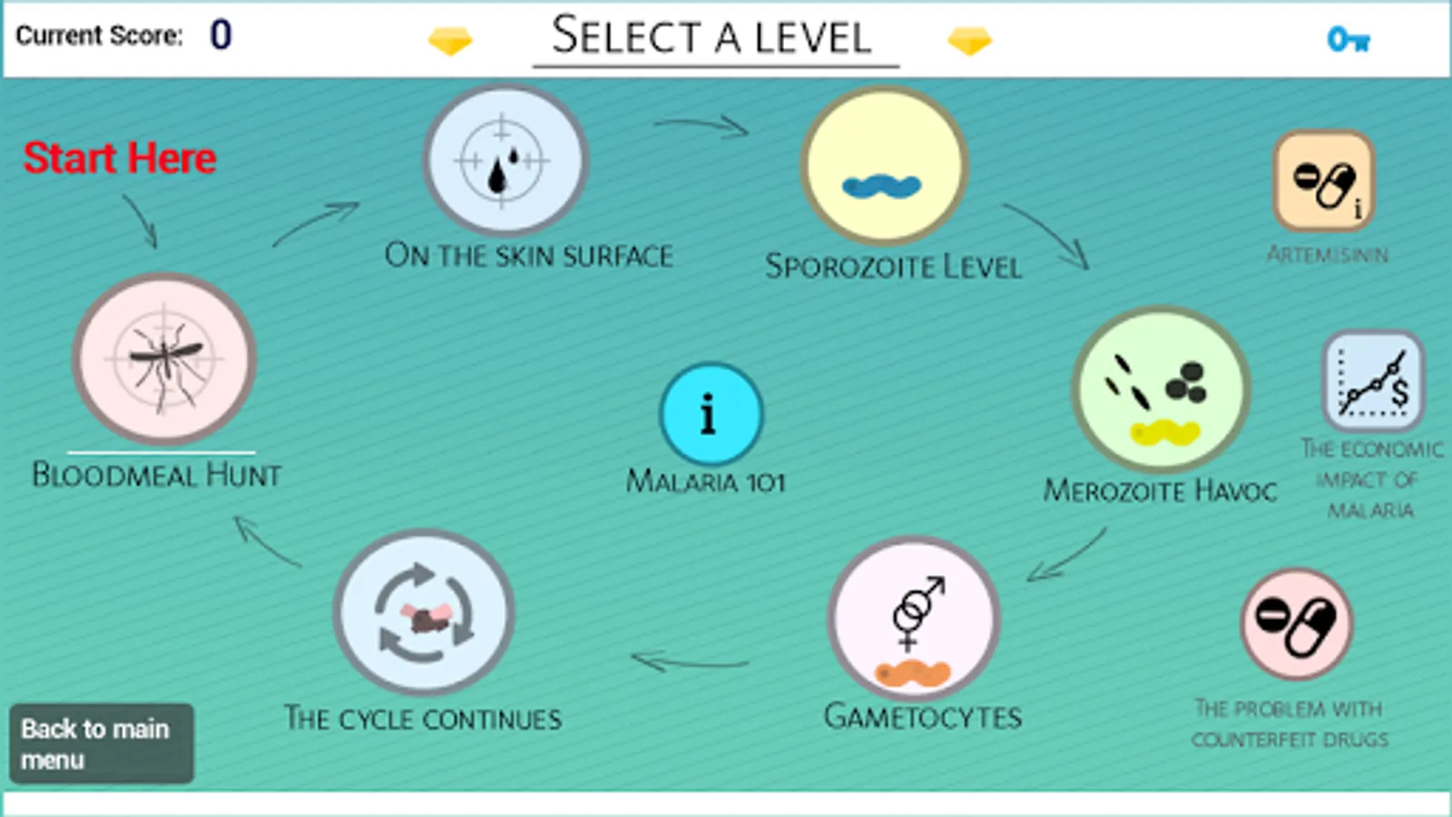 The Life Cycle of Malaria is an edutainment game that informs players about malaria in a creative manner. By allowing players to role-play as the mosquito and the malaria parasite, and interacting with different stages of the disease's life-cycle, this application offers an alternative way of learning about malaria.