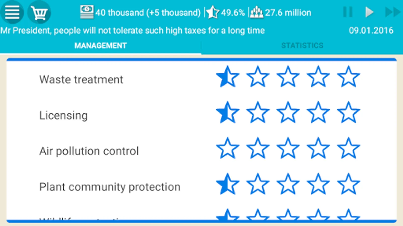Are you sure? Prove it! The "President Simulator Lite" game lets you rule one of the 163 modern countries. Politics, the media, espionage, natural disasters, wars, taxes, crime fighting… Show your strength, wisdom and perseverance. Build a build a superpower that dictates its rules, otherwise the world will smash your country.