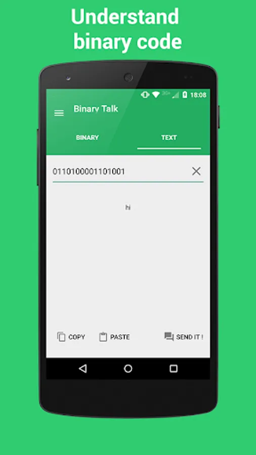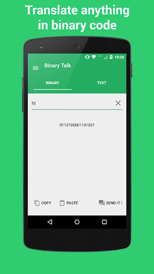 Conversion from binary code to text and vice-versa is done instantly. As you type letters you’ll see those represented in binary and with a simple tap you can switch to the binary-to-text converter. Once you finish writing your message, you can easily copy that binary code (or text) and paste it elsewhere. This way you can send messages encoded in binary text via SMS, email or any other social network. Since the messages show as sequences of 0’s and 1’s, only those with some technical knowledge will know how to decipher binary to text. Have fun while dialogging in binary code but also benefit from its privacy.