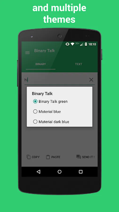 💭 Multiple app themes. Binary Translator comes by default with a -green-ish theme.k If that doesn’t align with your taste you can pick one of the other available themes, Material Blue or Material Dark Blue. No matter the theme the translation from and to binary is done at the same blazing speed. Now you can do binary conversions in your own style!