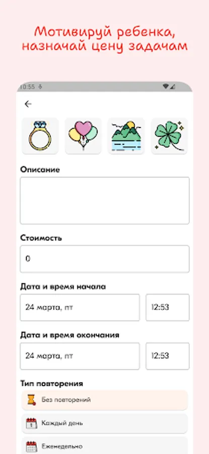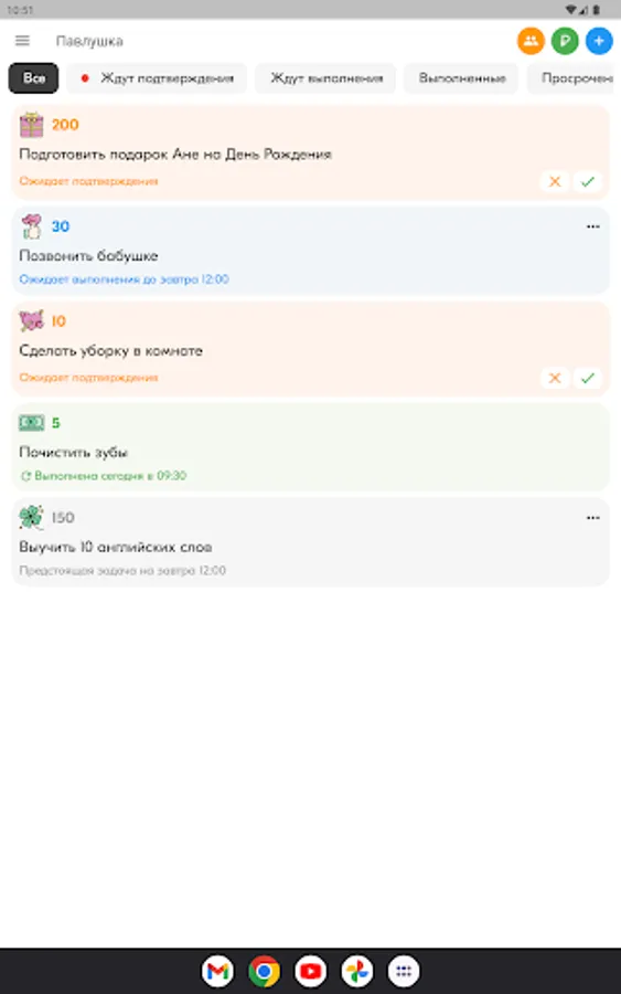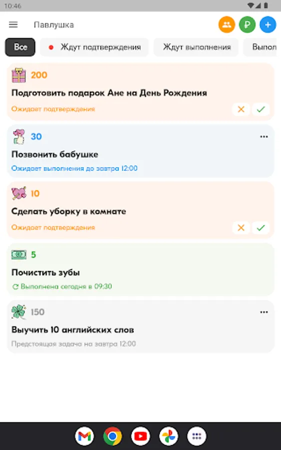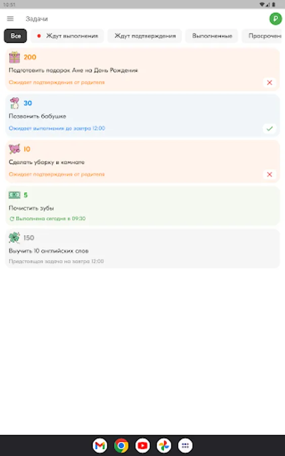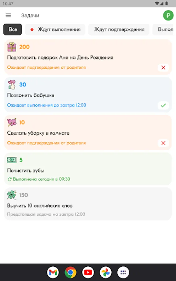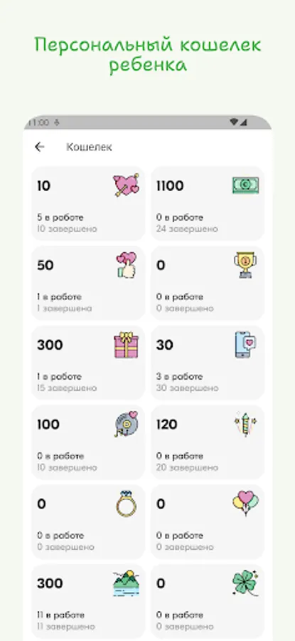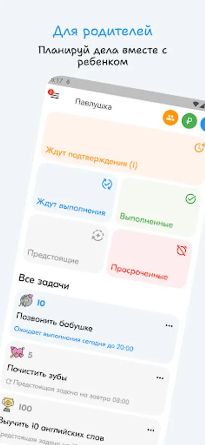 Parents create tasks for the child - from lessons - to household chores, and assign a conditional price. The child completes them and, after verification by the parent, earns points. Agree with the child on what he can exchange the accumulated points.