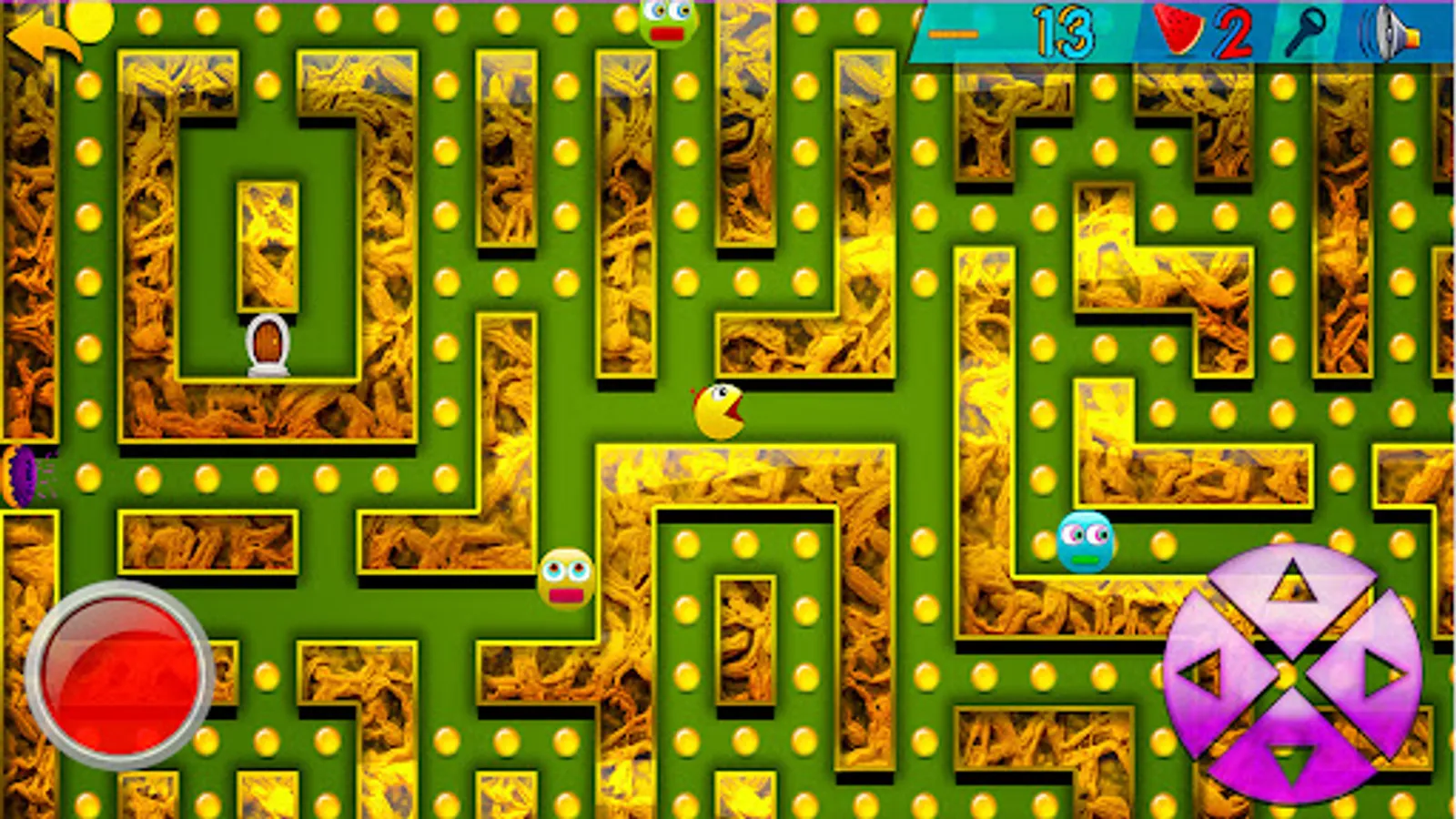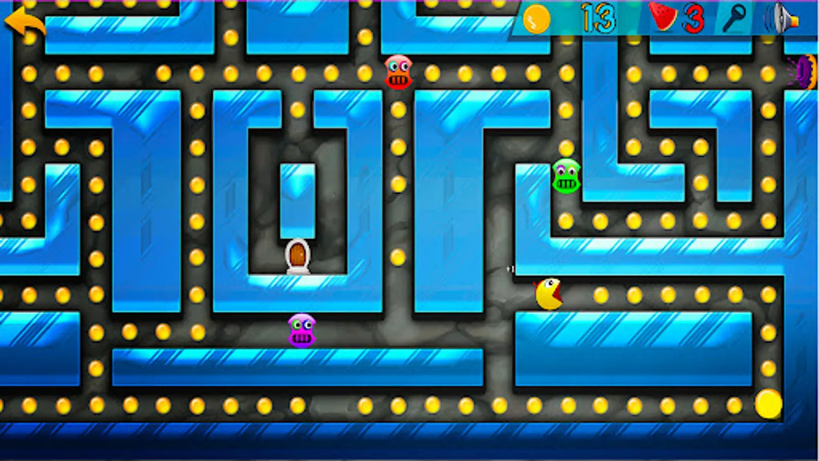 Catch the big yellow ball (you will hear fast theme music) for enable fast runner mode and Pac the maze runner can eat monsters, leaving behind a colorful and beautiful animated track like a classic arcade.