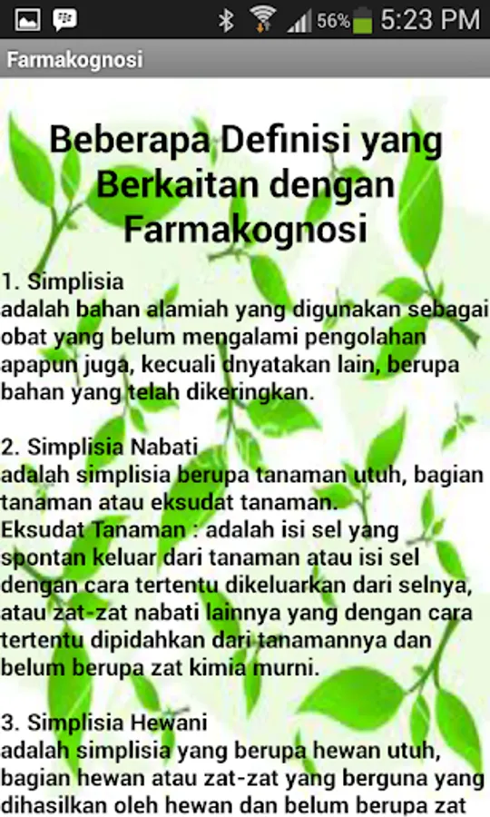 Aplikasi ini sangat bermanfaat bagi orang yang ingin belajar Farmakognosi atau hanya mencari tahu tentang apotek. Namun, aplikasi ini ditujukan kepada orang-orang yang bekerja di bidang Industri Obat Farmasi. Aplikasi ini sangat berguna sebagai e-book, dapat berfungsi sebagai referensi ketika mencari tahu tentang minyak mentah, ada juga istilah yang sering digunakan minyak mentah.