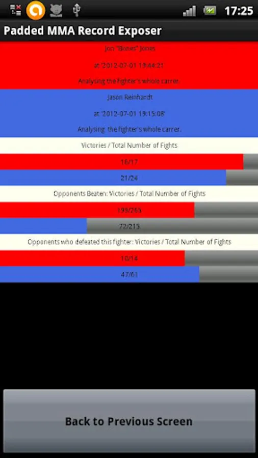 I developed this app to help me gather information about whether a fighter was the real deal or not, and as a way to reach a final decision about putting a bet on a relatively unknown fighter. Is that perfect 20-0 record really impressive? What if the average opponent beaten by this guy wins 2 fights out of 10? Or what if he wins against guys with less than 0.50 records, but loses to guys who win five or more out of 10?