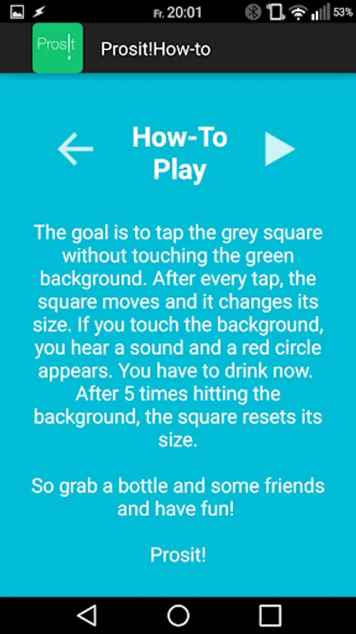 The goal of the game is to always tap the grey square. After each tap the square changes its size and position randomly. If you are lucky, the square rests big, otherwise you probably miss it and the Prosit!-Circle appears. At this point you have to drink something of your choice. After every tap, its the turn of the player next to your right.