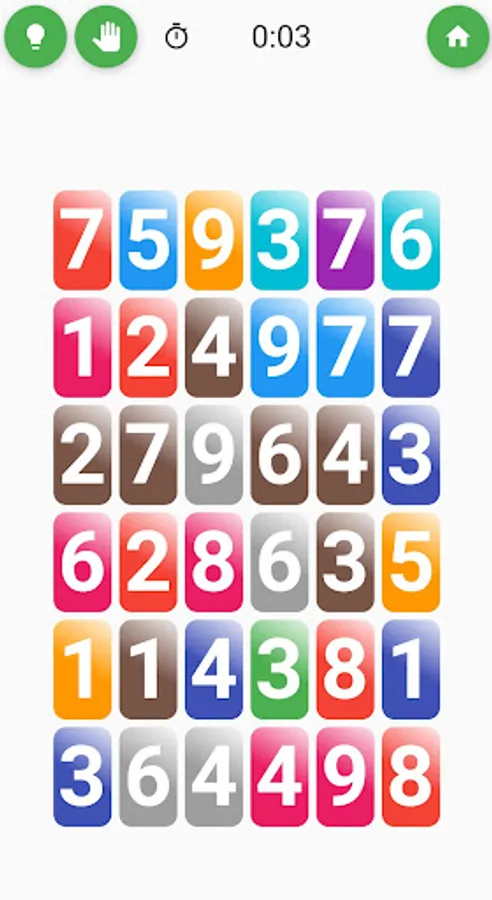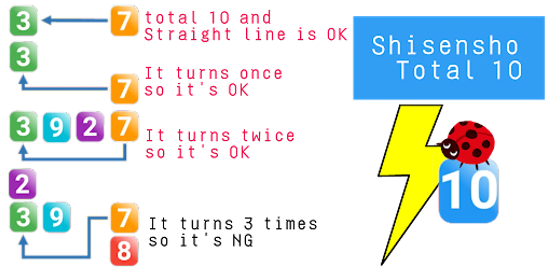 ●Take away two numbers and total 10 at each time. When all the number are out, the game is clear!