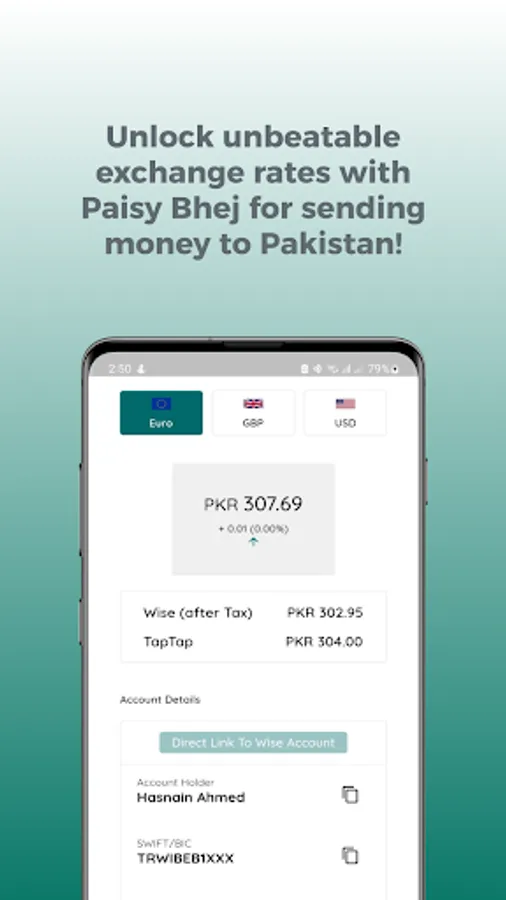 Introducing PaisyBhej - the ultimate money exchange app designed to make sending Euros to Pakistan a breeze. With PaisyBhej, you can enjoy fast, secure, and cost-effective money transfers, all at your fingertips.