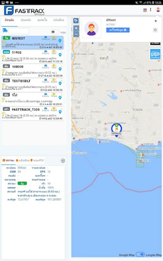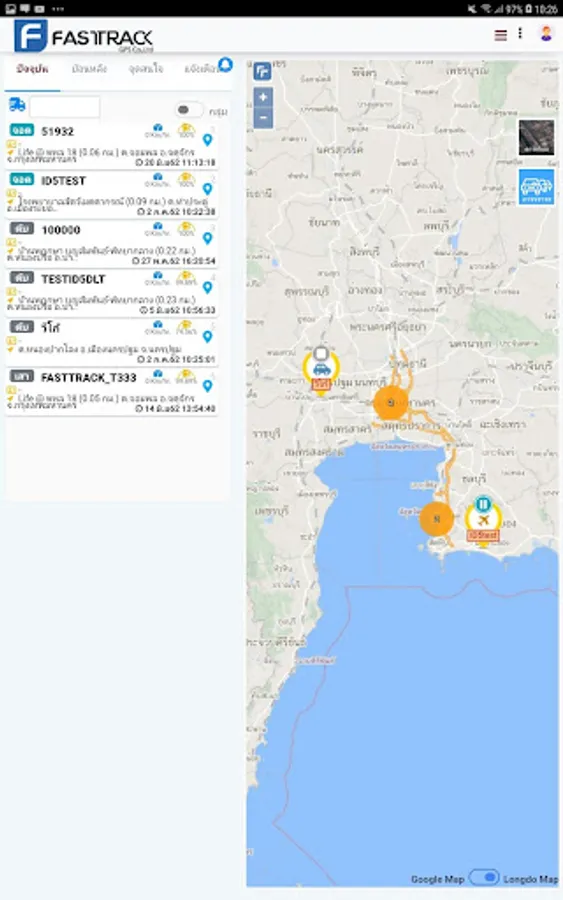 Vehicle Tracking Program Browse Current Position Route back Speeds Engine oil level status, etc. and can also alert the user. Make them aware of events Like a car running out of space Moved The machine is not receiving power Or removing poles, etc. via the screen of the application, Email or SMS.