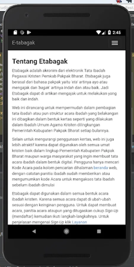 Selain untuk mengurangi penggunaan kertas, web ini juga lebih atraktif karena dapat digunakan oleh semua umat kristen baik dalam lingkup Pemerintah Kabupaten Pakpak Bharat maupun warga masyarakat yang ingin membuat tata acara ibadah dalam bentuk digital. Pengguna hanya mencari Kode Acara pada kolom pencarian dihalaman beranda web, dengan catatan panitia ibadah sudah memberikan atau mengumumkan kode Acara untuk mengakses tata ibadah sebelum ibadah dimulai