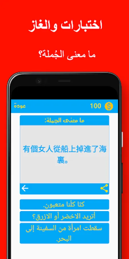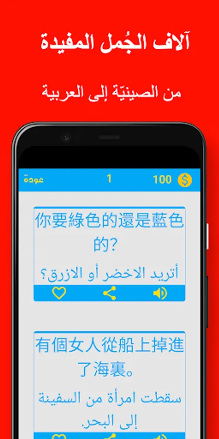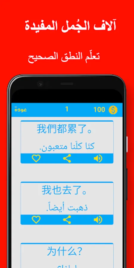 The application contains a lot of Chinese sentences and phrases translated into Arabic with their pronunciation