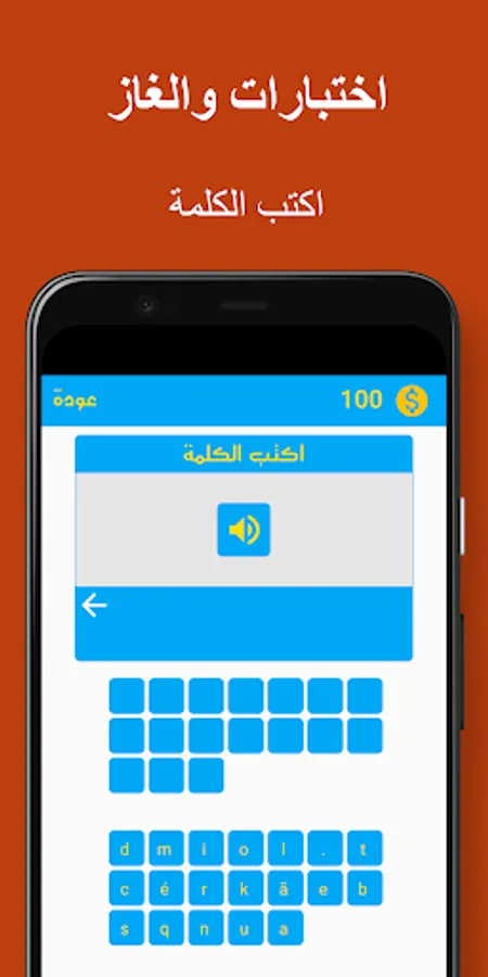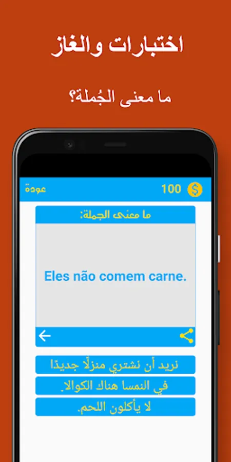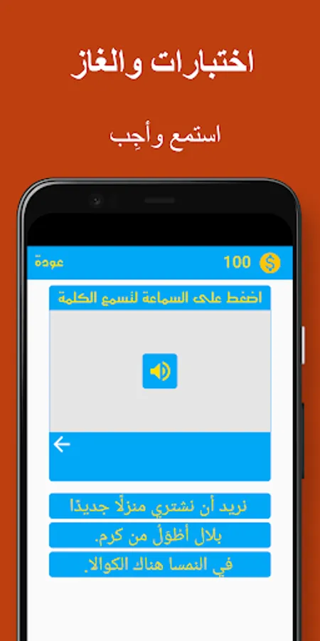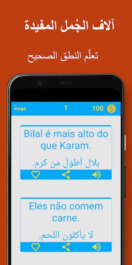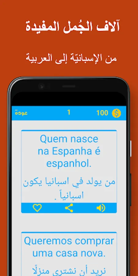 The application contains a lot of Spanish sentences and phrases translated into Arabic with their pronunciation