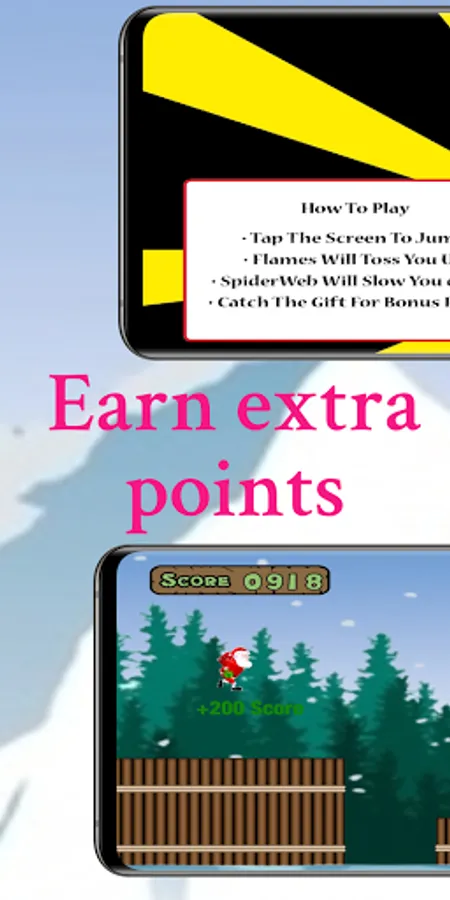 Pick up the gift boxes revolving to gain bonus points. Spiderwebs will slow you down, whereas, bonfire will throw you in the air.