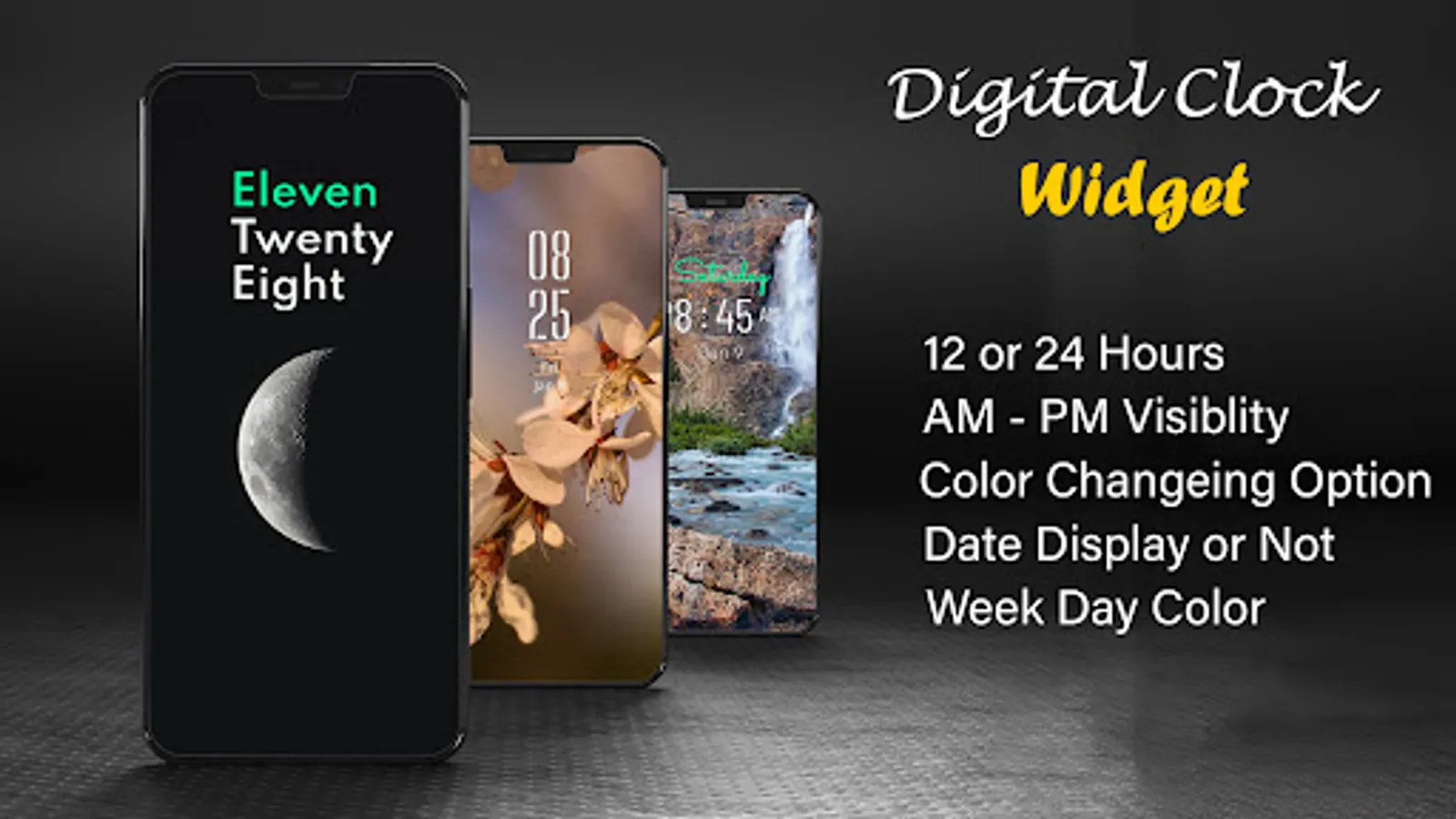 Digital Clock widget is a Elegant widget for your smart phones Enjoy personalizing your home screen with this Digital clock Widget. Please tap on the widget to change a clock design. More Then 20+ Widget Design Waiting For you.