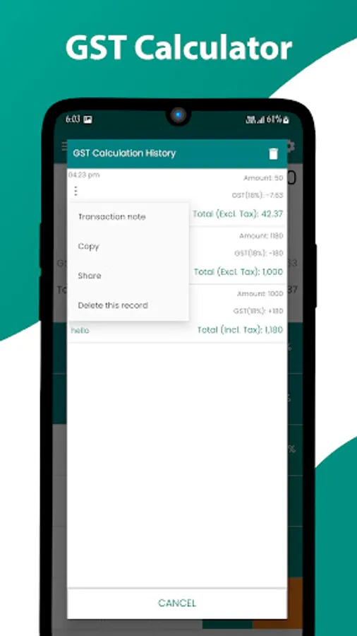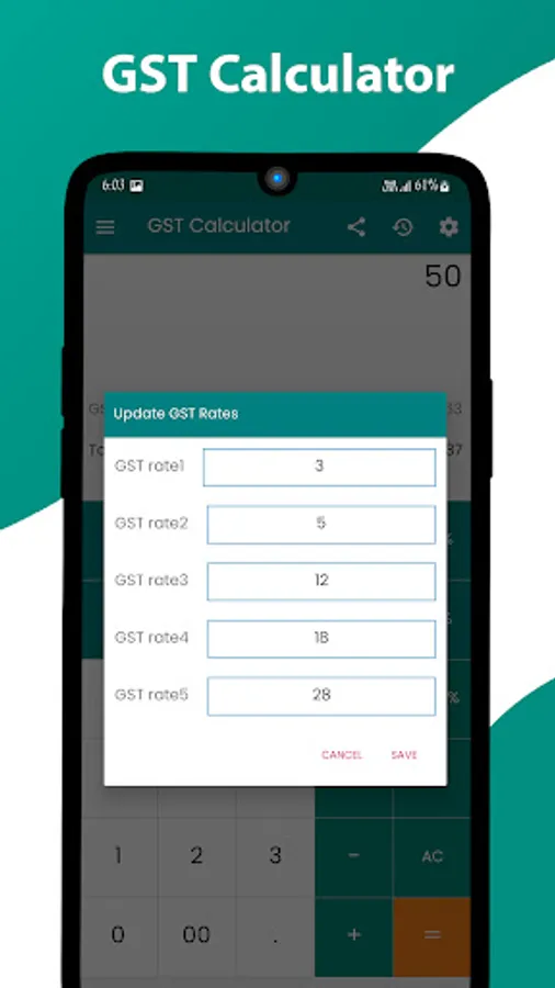 We have a predefined set of GST Rates which are 3%, 5%, 12%, 18%, and 28% so that you can quickly carry out the calculation. You can customize the Rates as per your need in settings. You can also share or copy your calculations with handy buttons.