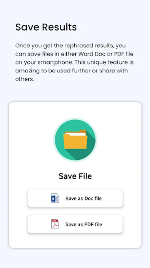 Once you get the rephrased results, you can save files in either Word Doc or PDF file on your smartphone. This unique feature is amazing to be used further or share with others.