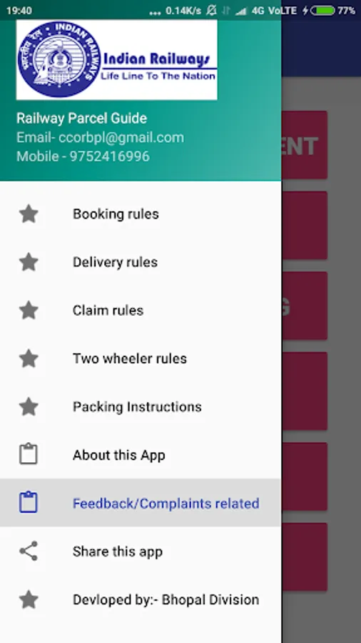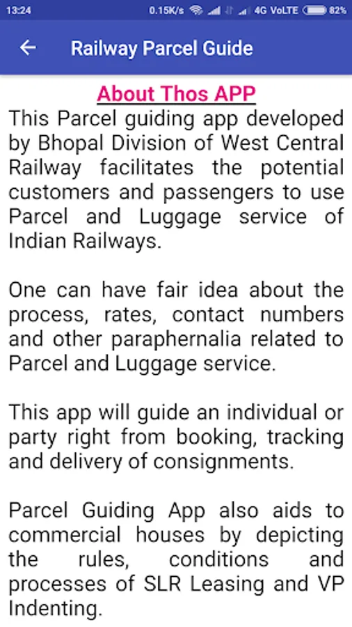 This Parcel guiding app developed by Bhopal Division of West Central Railway facilitates the potential customers and passengers to use Parcel and Luggage service of Indian Railways.