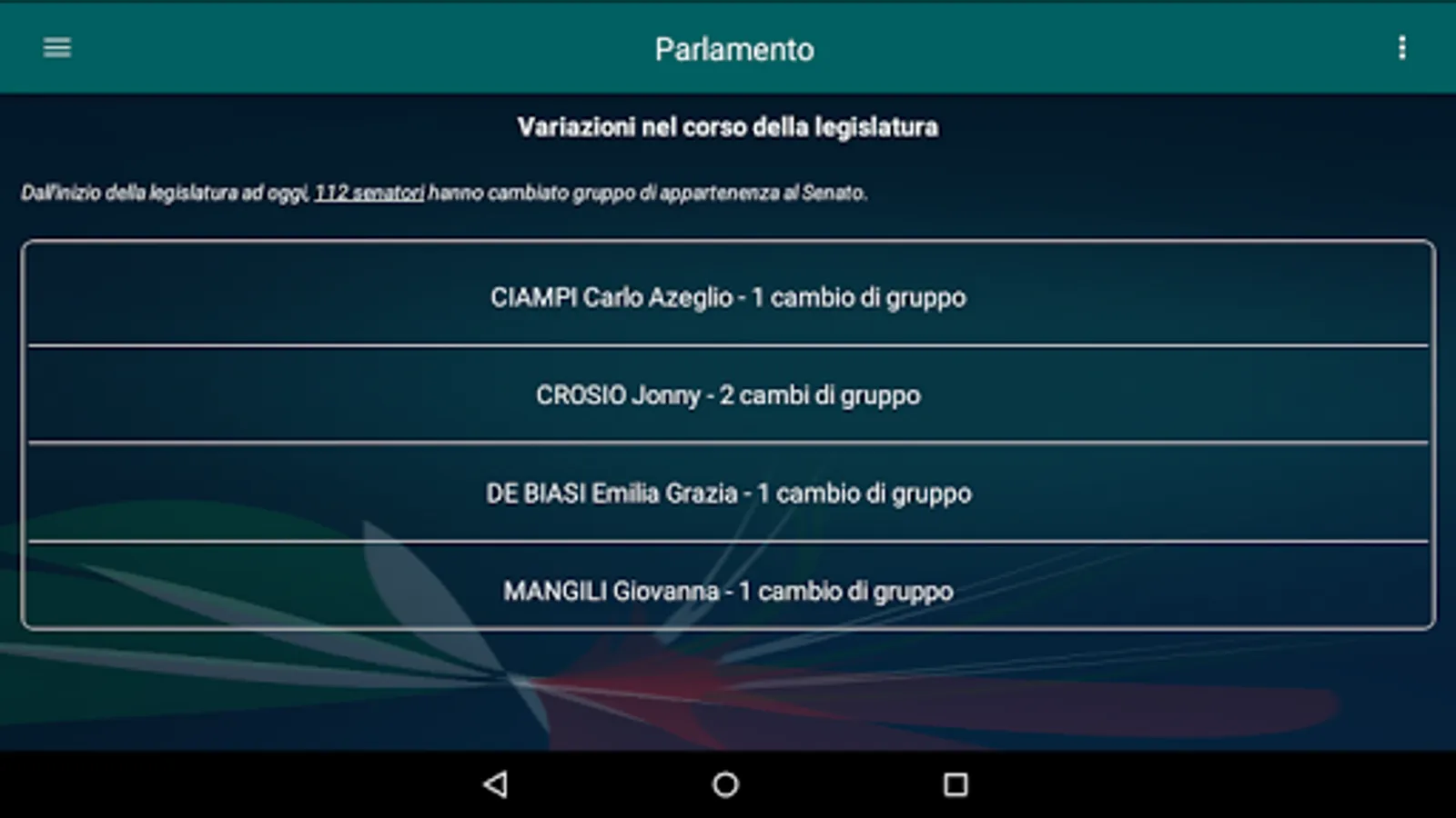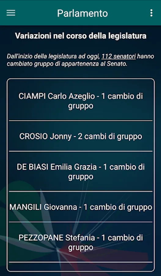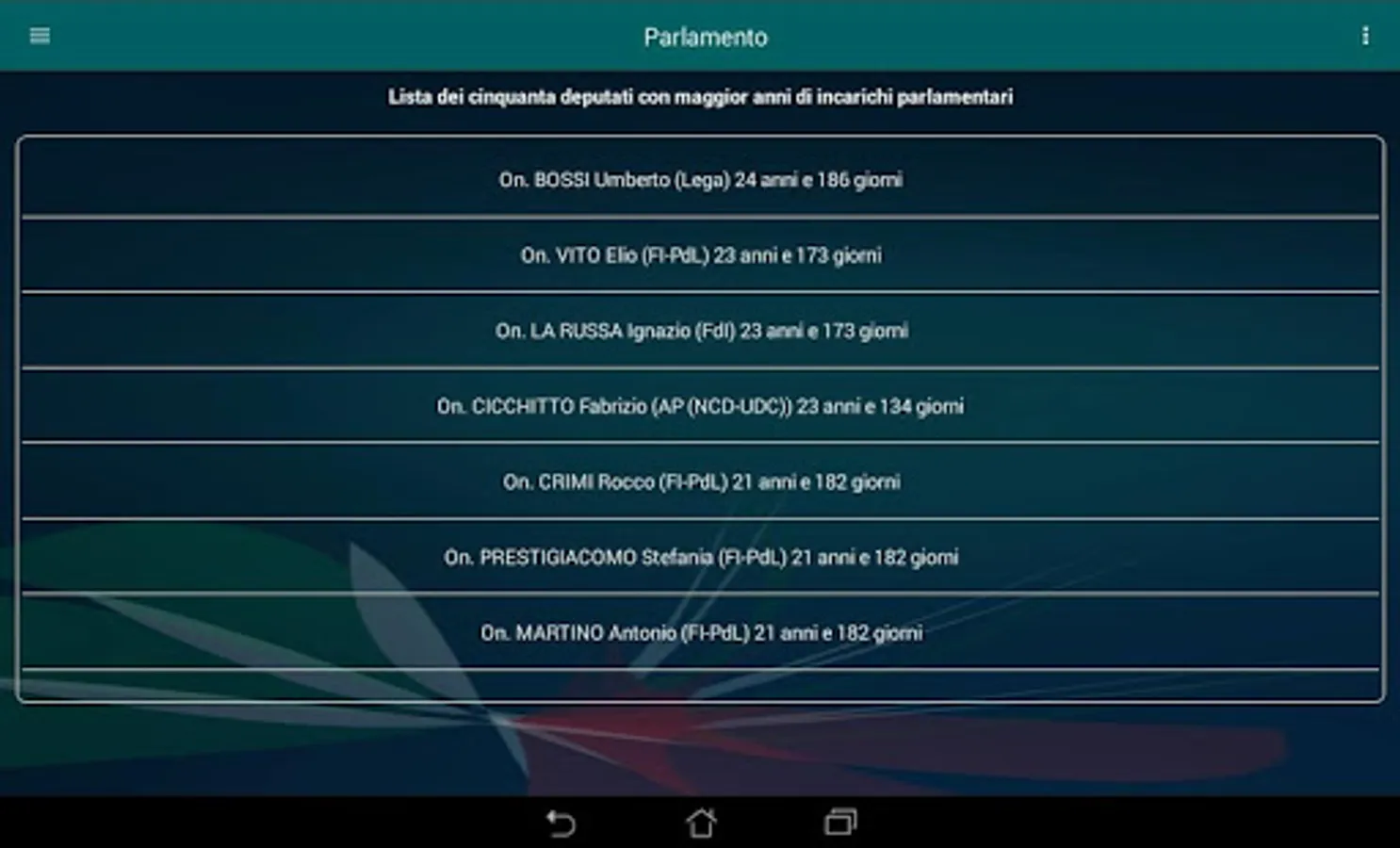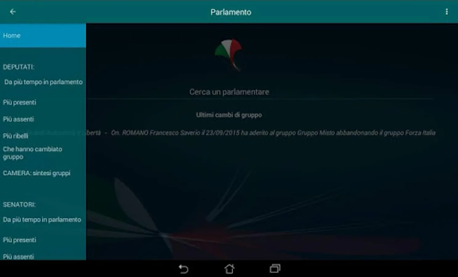 The application allows you to view the latest changes that took place in the parliamentary groups and the list of deputies and senators who sit for longer in the Italian Parliament.